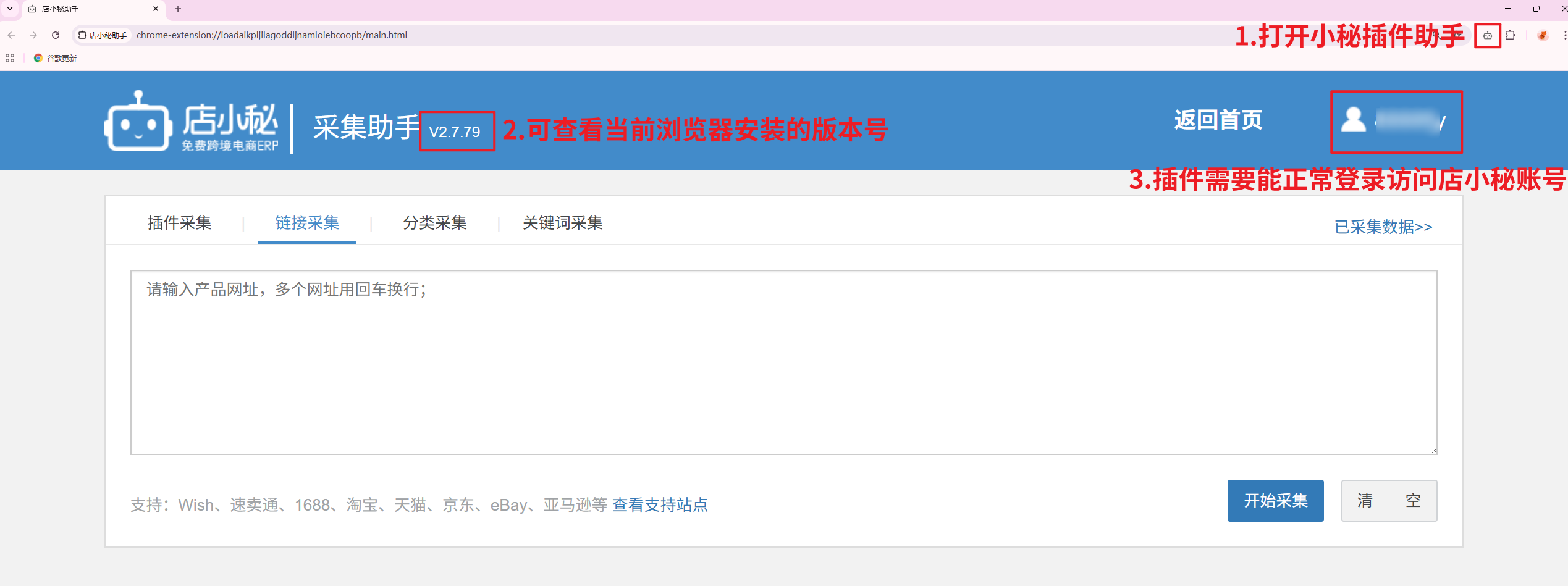 2、检查采集插件是否为最新版本,更新至最新版本后,再重新采集试下 点击查看安装流程
