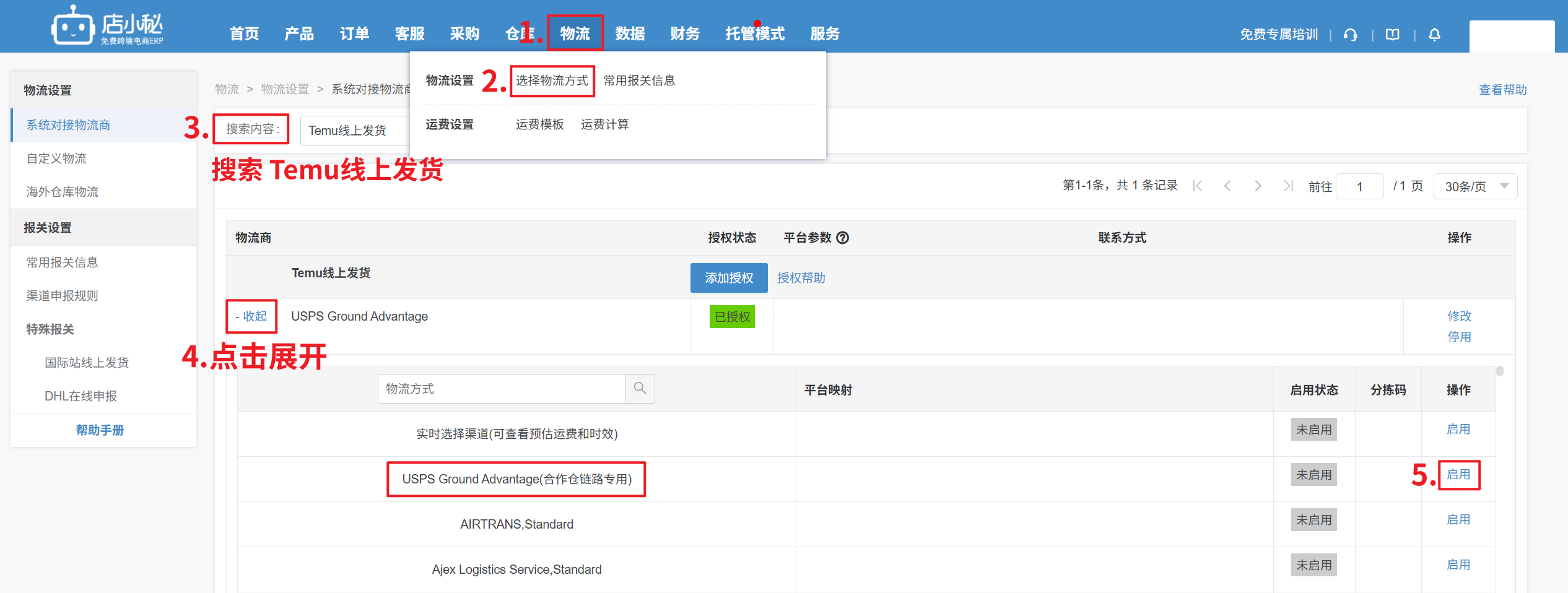 第二步:【物流—选择物流方式—搜索“Temu线上发货”—点击展开—启用“USPS Ground Advantage(合作仓链路专用)”渠道】