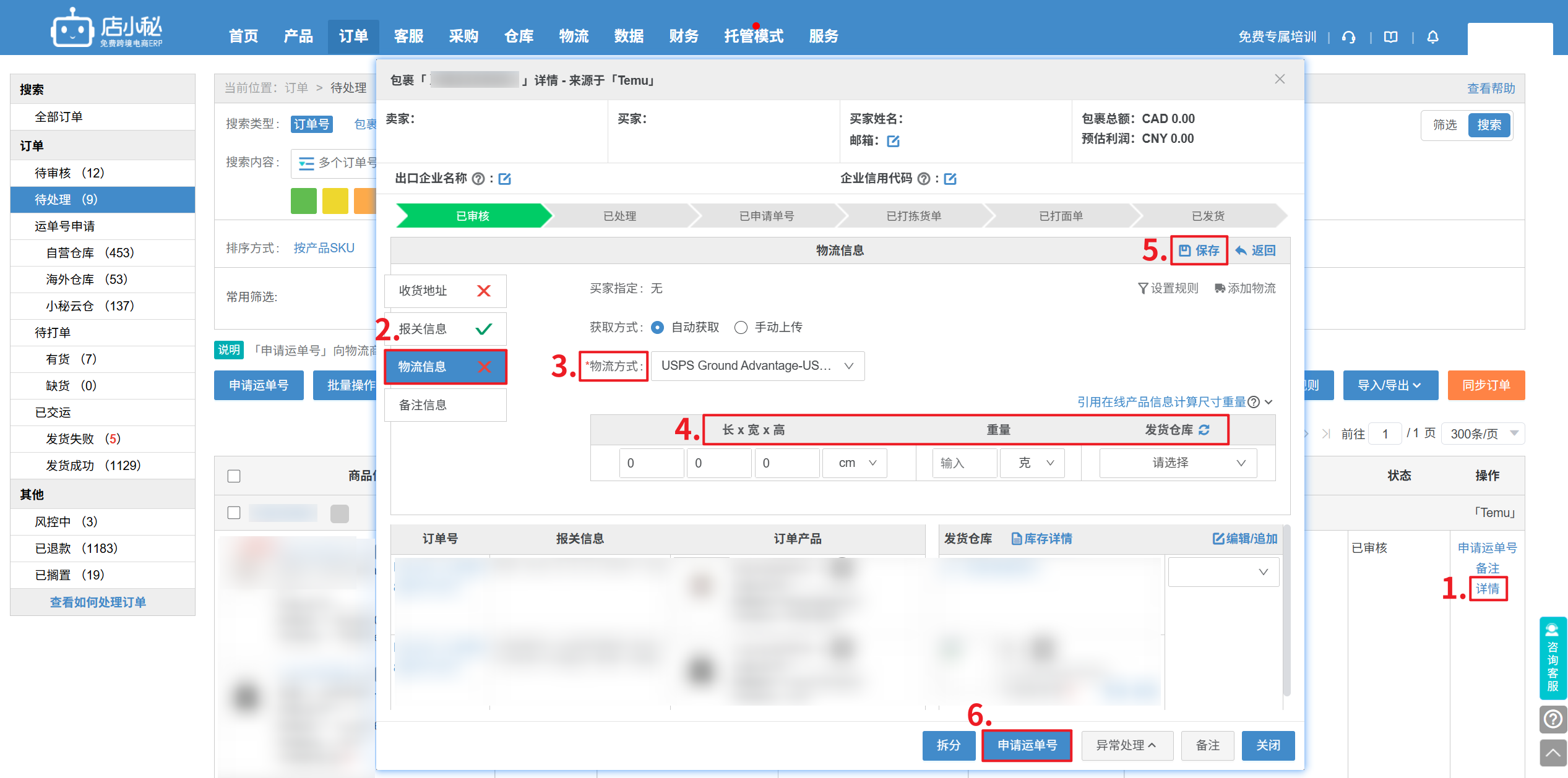 【订单详情—物流信息—编辑—选择渠道—设置尺寸/重量/发货仓库—保存并申请运单号即可】