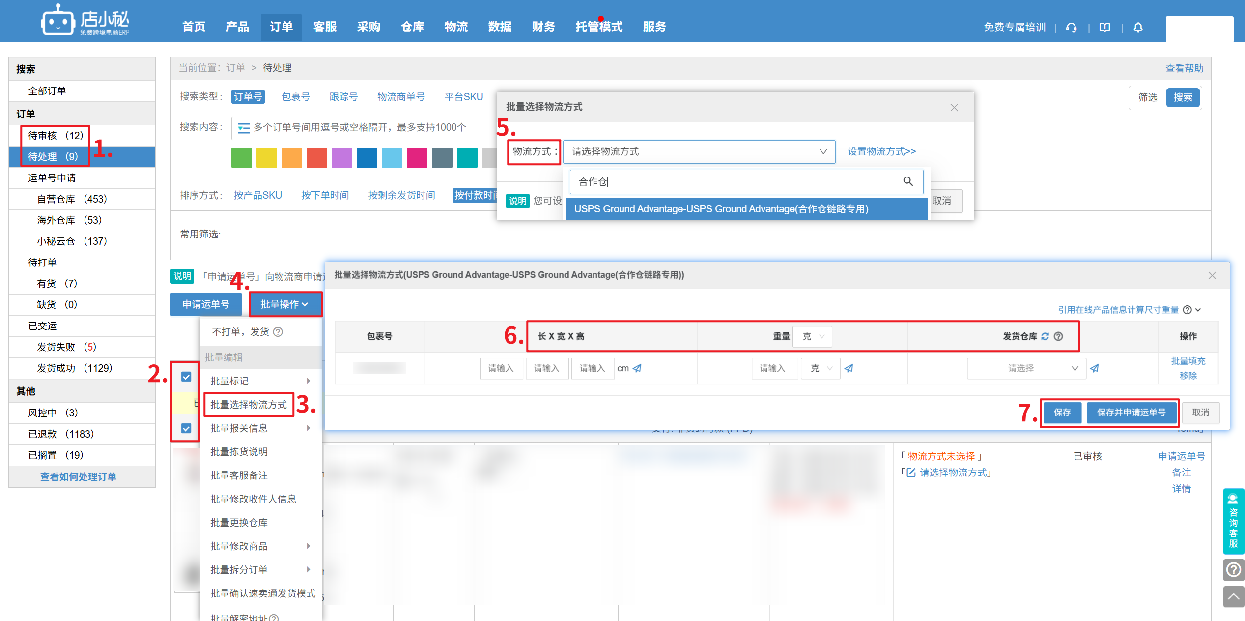 【待审核/待处理状态—勾选订单—批量选择物流方式—选择渠道—设置尺寸/重量/发货仓库 —保存并申请运单号即可】