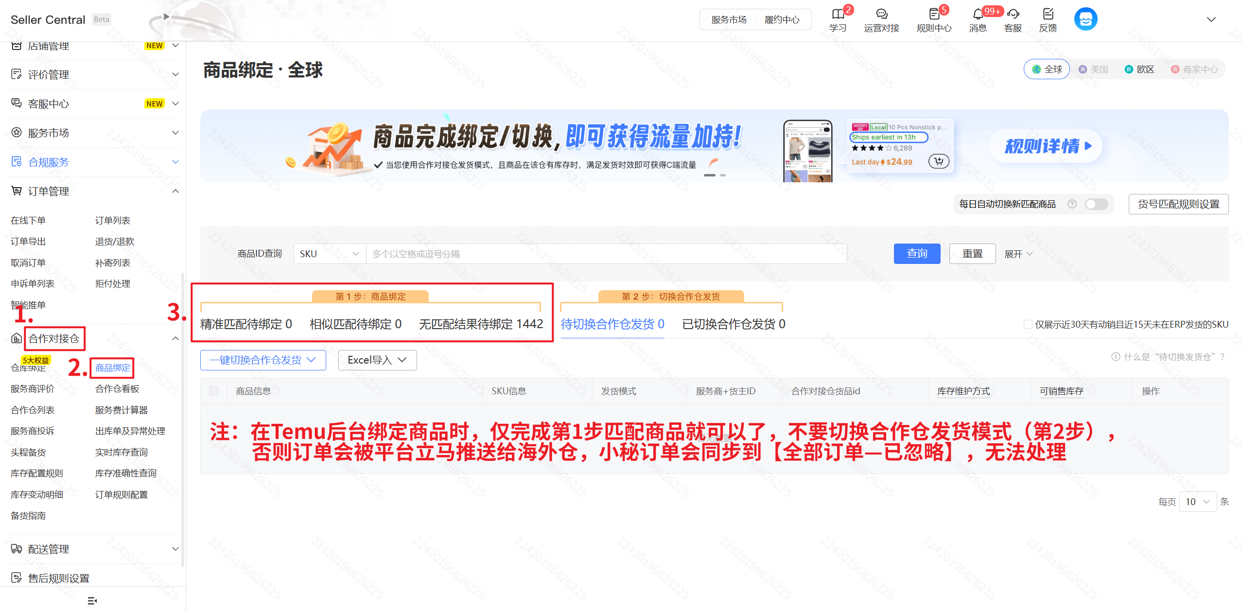 【3】在Temu后台绑定商品时,仅匹配商品就行了,不要操作切换合作仓发货模式,否则订单会被平台立马推给海外仓,