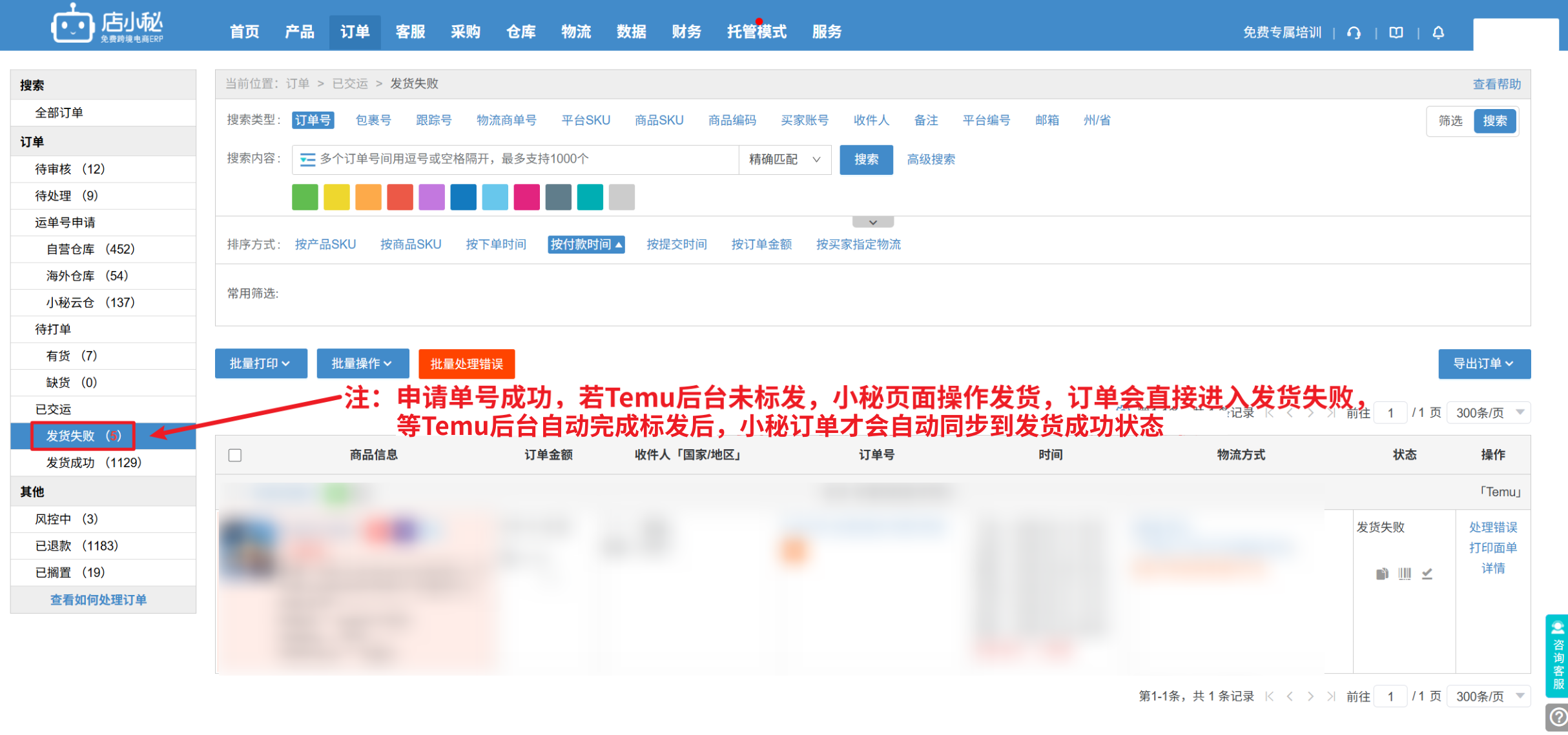 注意:若Temu后台未标发,小秘页面操作发货,订单会直接进入发货失败