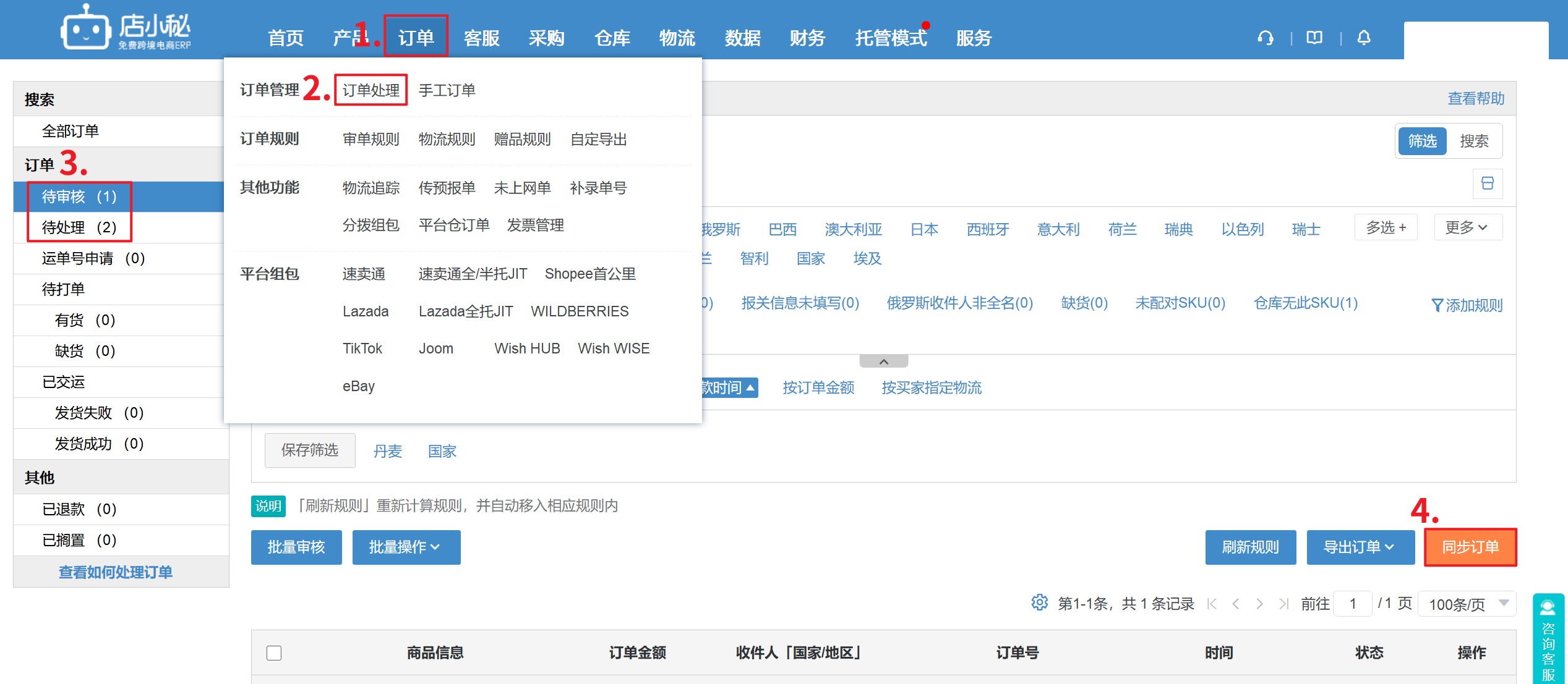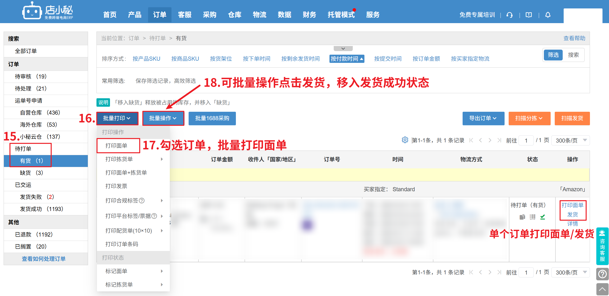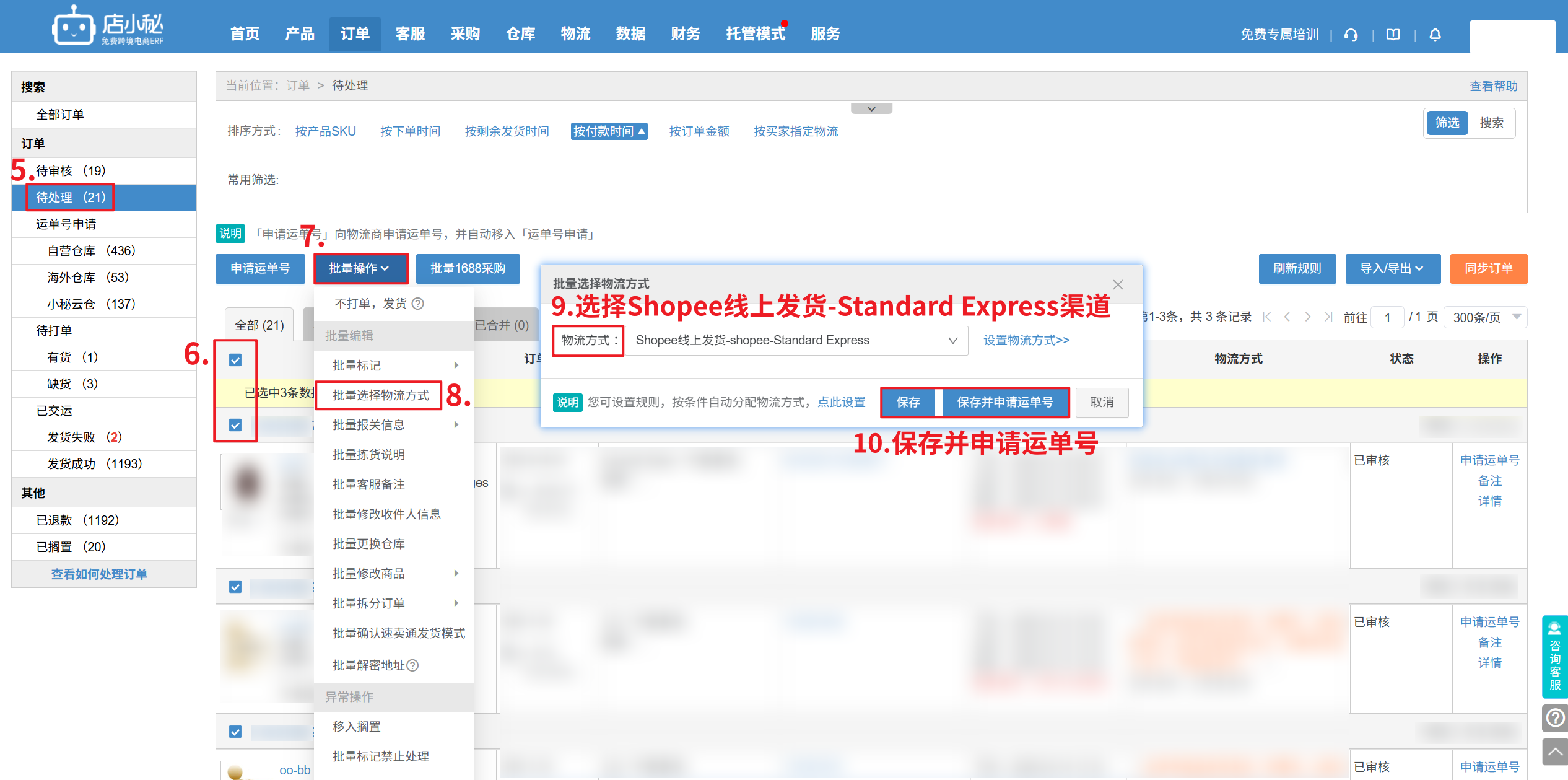 【订单—待审核/待处理—同步订单—选择物流渠道—申请运单号—移入待打单—打印面单—提交发货即可】