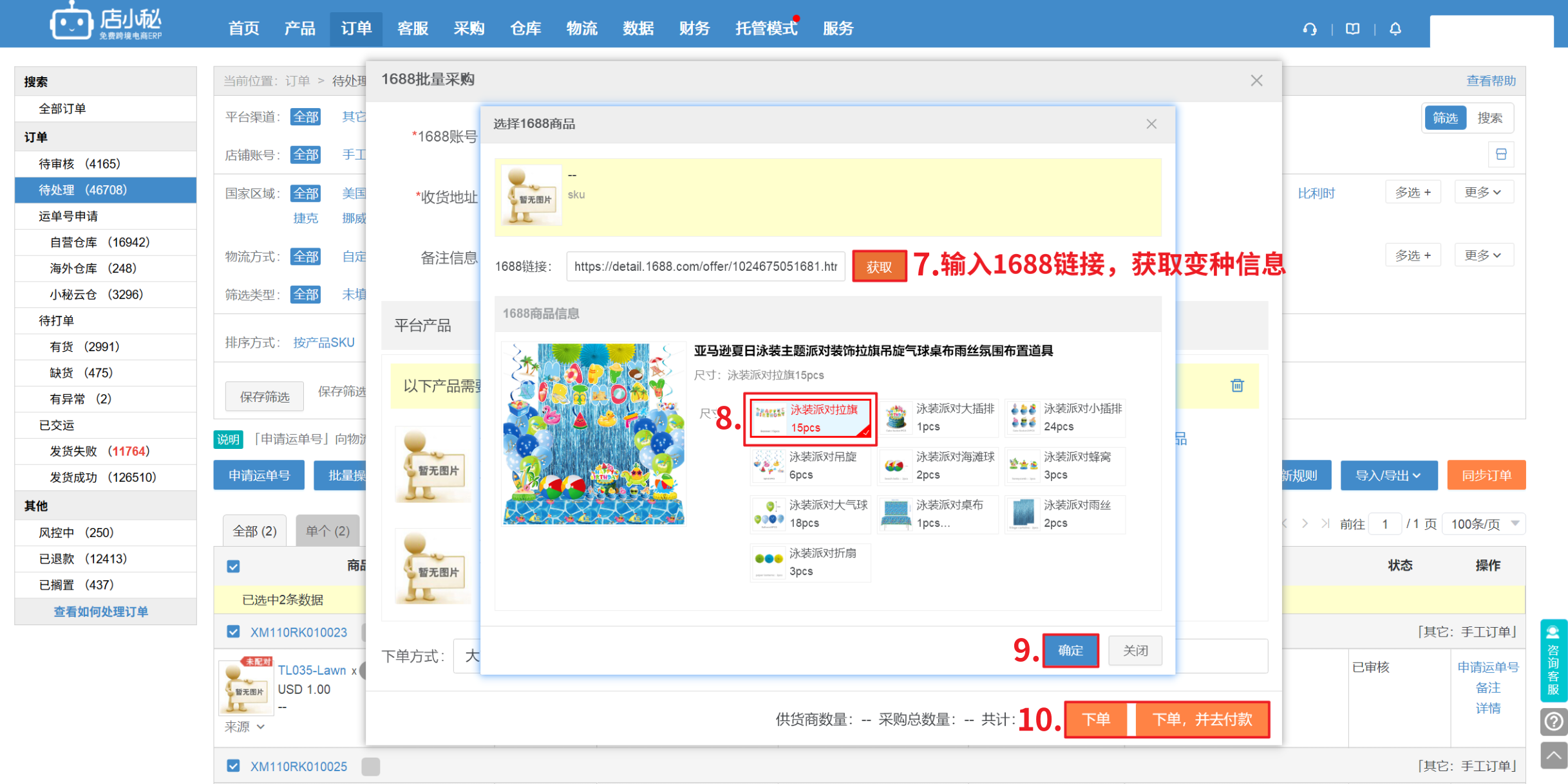 第三步:【输入1688产品链接—获取变种信息—选择1688产品规格—确定—点击下单即可】