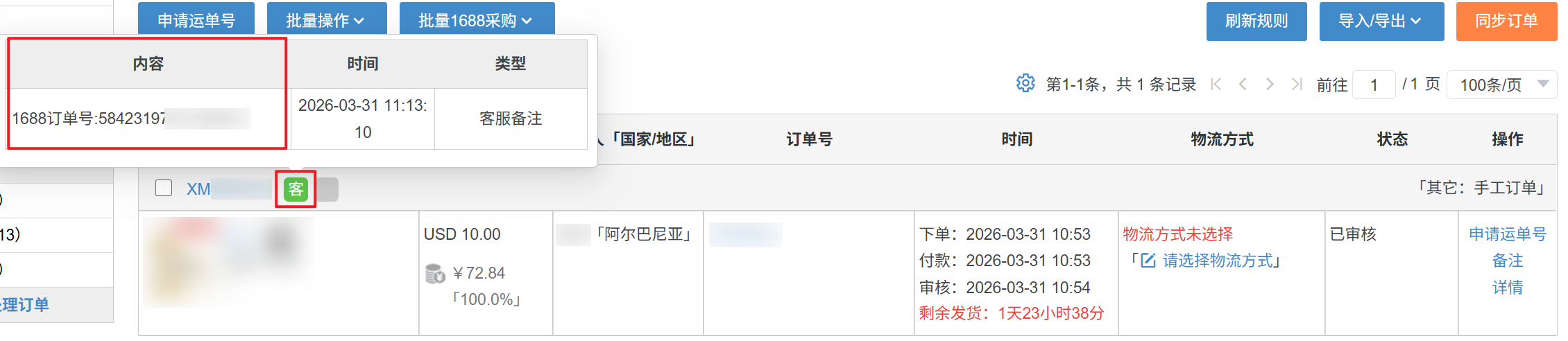 ① 若勾选1688订单号添加到订单备注:下单之后,店小秘页面订单会显示客服备注内容为1688的订单号