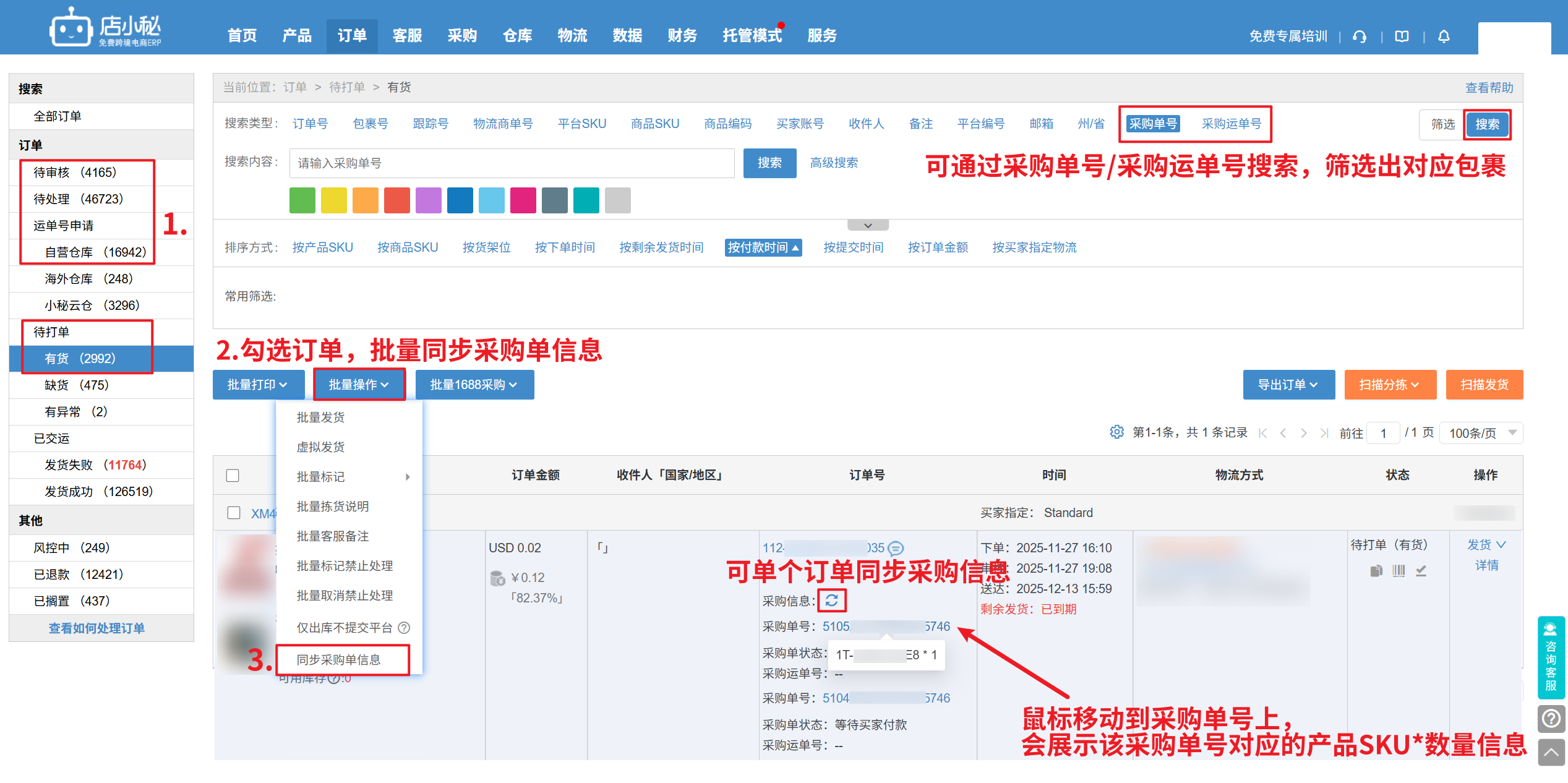 第四步:下单成功后,系统会自动同步获取1688订单号、国内物流单号、采购单状态,可单个/批量同步采购单信息