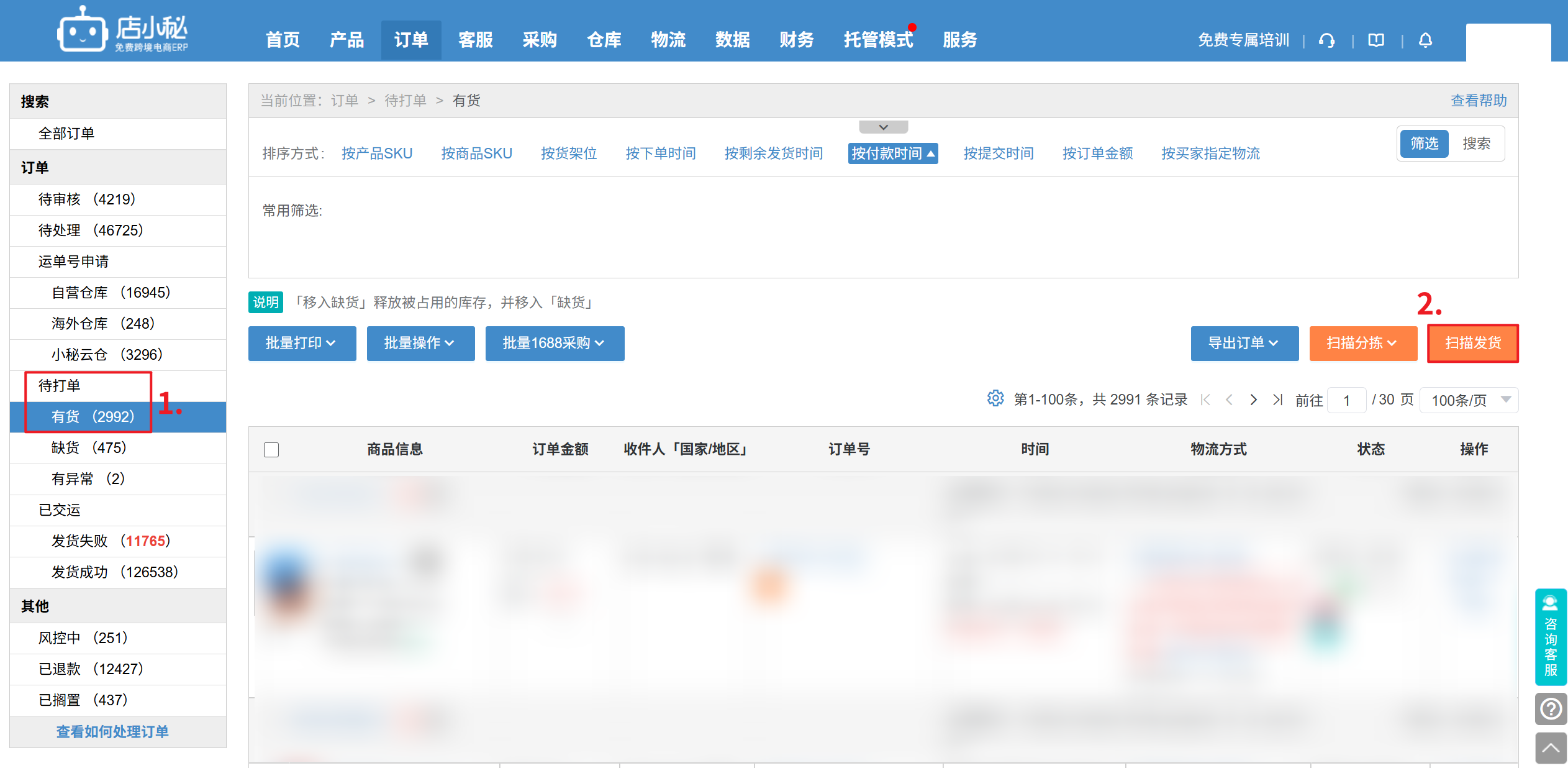 第五步:1688采购到货后,可直接扫描国内快递单号识别对应平台订单,自动打印出面单,并提交发货