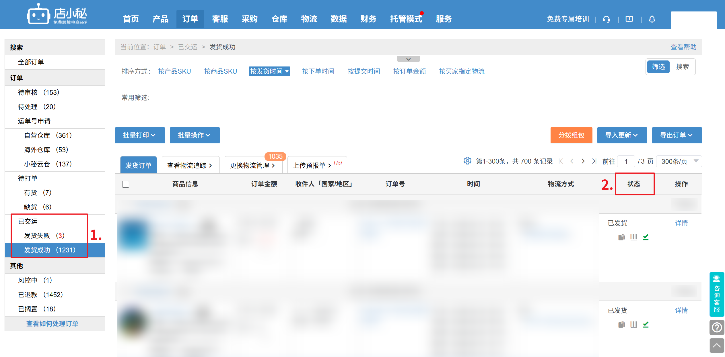 第六步:扫描发货后,订单会进入已交运状态,可查看订单最终提交结果状态