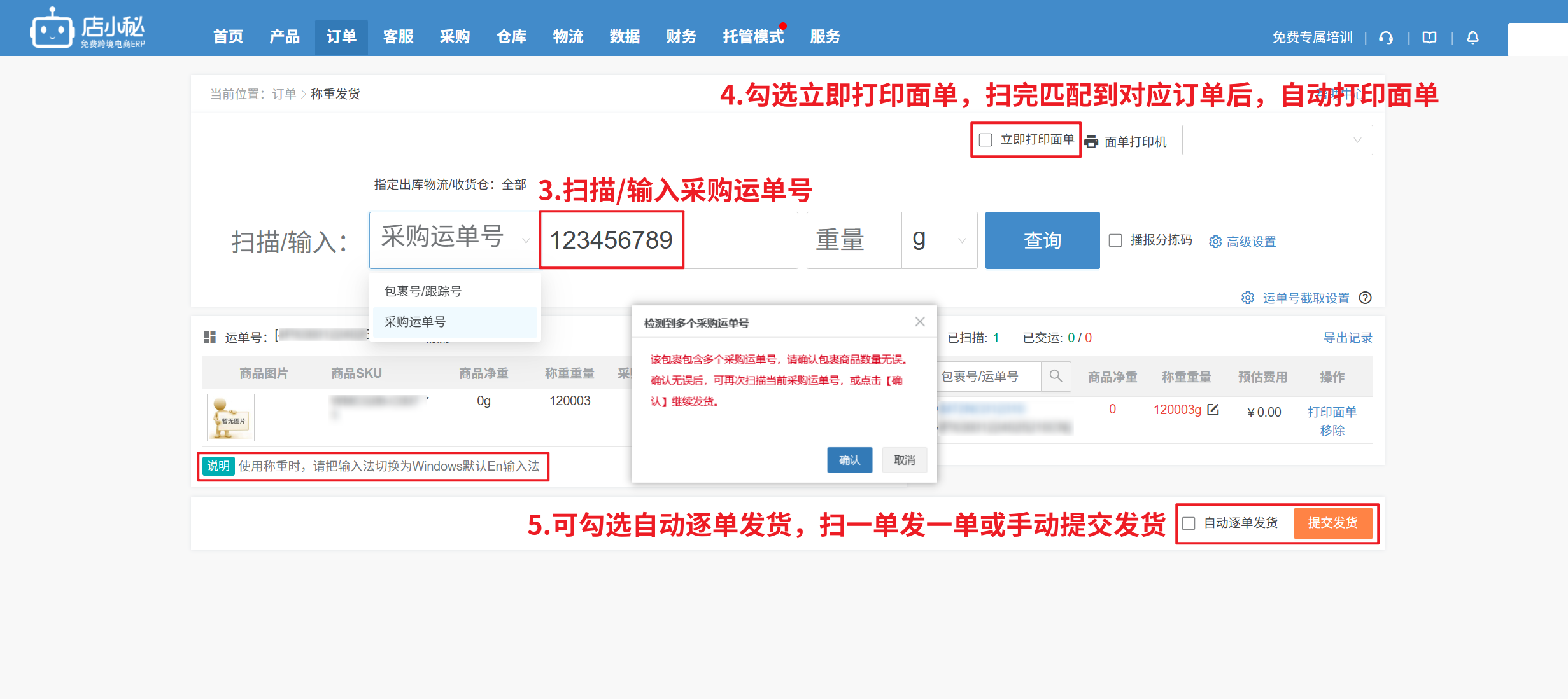 注意:如果1个包裹含有有多个(≥2)采购运单号,会触发弹窗提醒,需扫描两次后,才可继续打印面单/发货