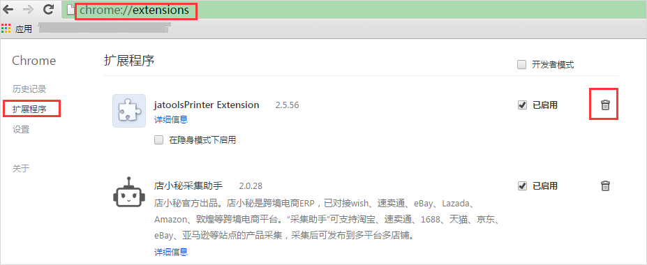 ②复制:“chrome://extensions/ ”到谷歌浏览器的地址栏,即可打开【扩展程序】页,将之前安装过的打印插件删除,如下图: