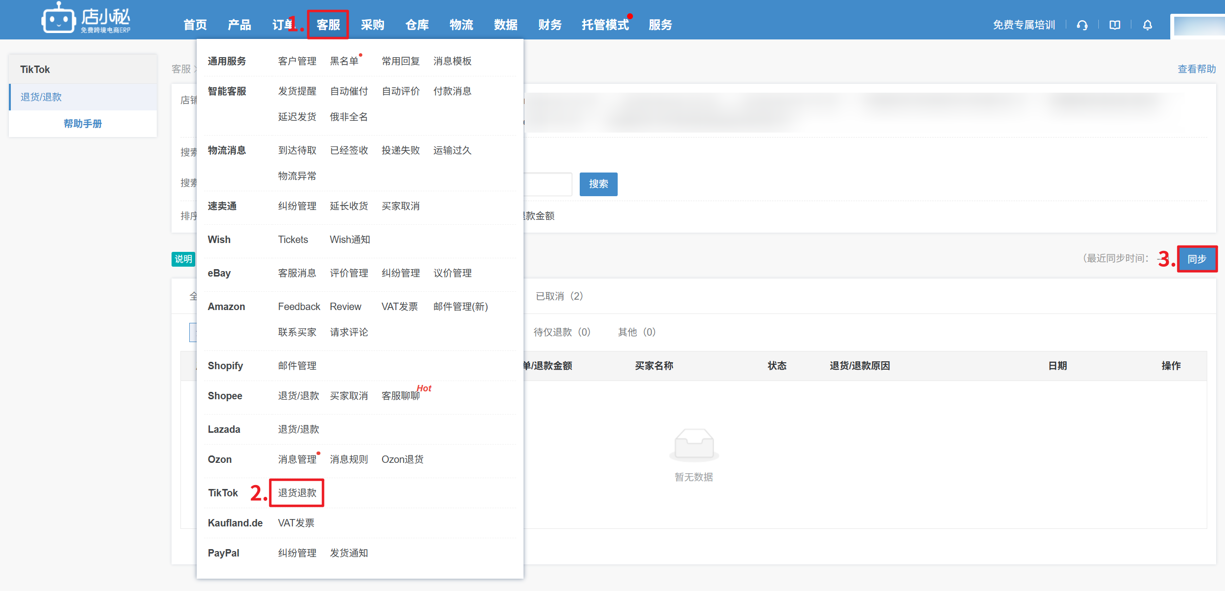 A2:到【客服—TikTok退货退款—点击同步】再查看