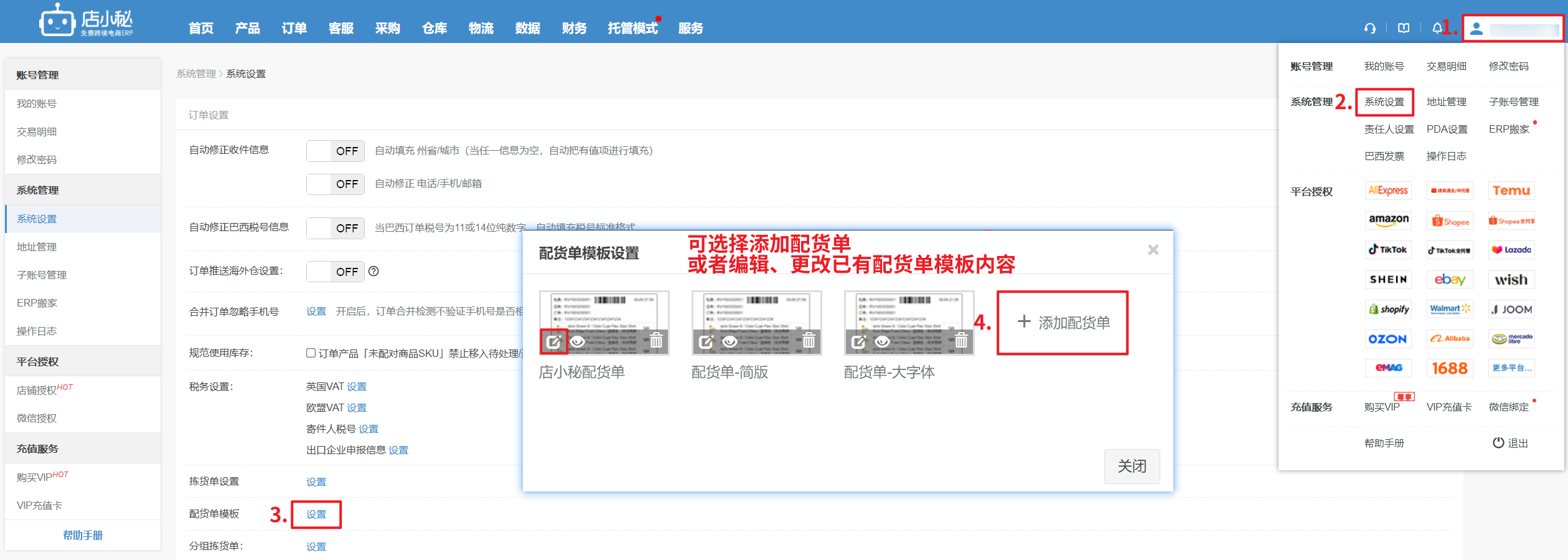 第一步:【登录小秘主账号—用户名—系统设置—配货单设置—编辑/添加配货单—自定义模板内容—保存】