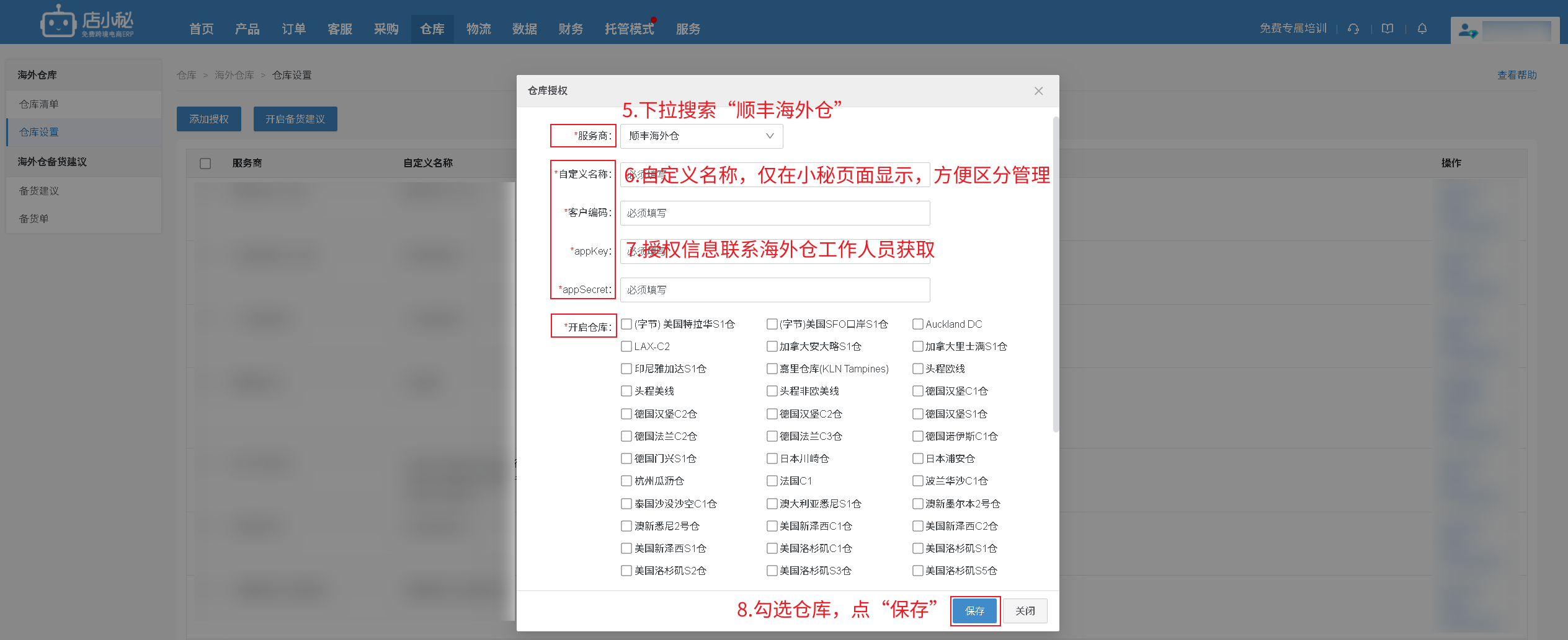 【仓库—海外仓库—仓库设置—添加授权—选择“顺丰海外仓”—自定义名称—联系海外仓工作人员获取—勾选仓库—保存即可】