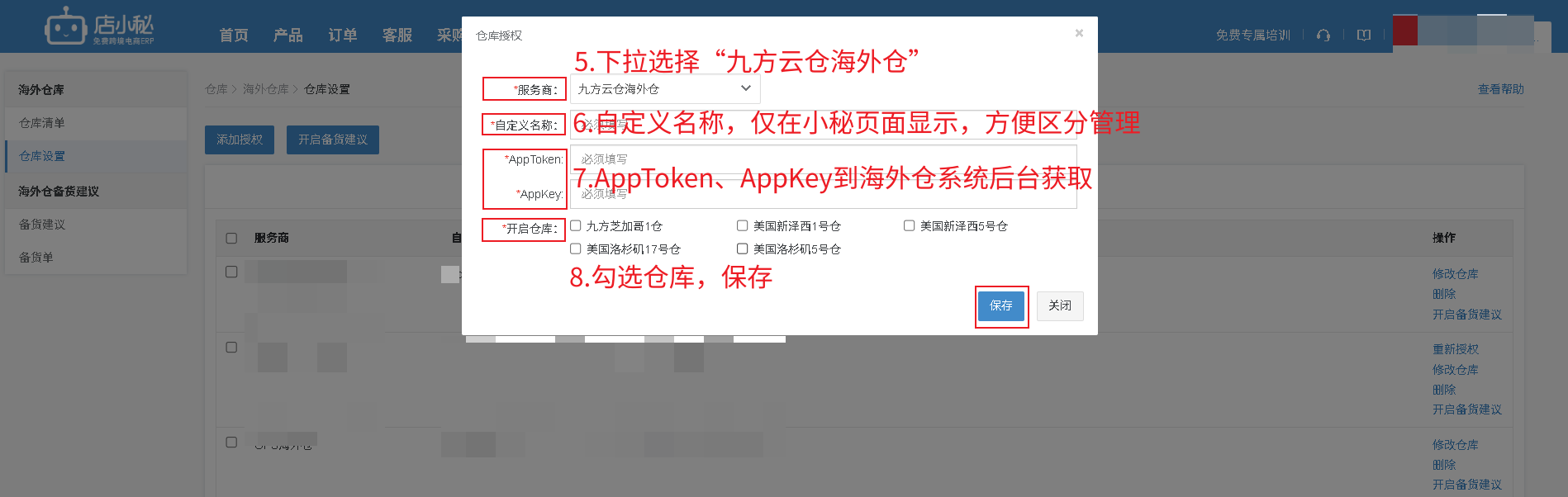 【仓库—海外仓库—仓库设置—添加授权—选择“九方云仓海外仓”—自定义名称、登录海外仓系统后台获取授权信息填写、勾选仓库—保存即可】
