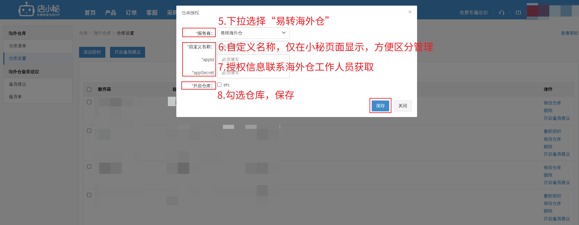 【仓库—海外仓库—仓库设置—添加授权—选择“易转海外仓”—自定义名称、联系海外仓获取授权信息、勾选仓库—保存即可】