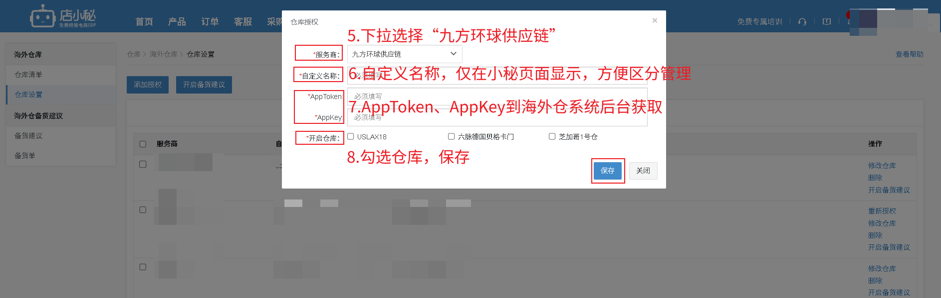 【仓库—海外仓库—仓库设置—添加授权—选择“九方环球供应链”—自定义名称、登录海外仓系统后台获取授权信息填写、勾选仓库—保存即可】