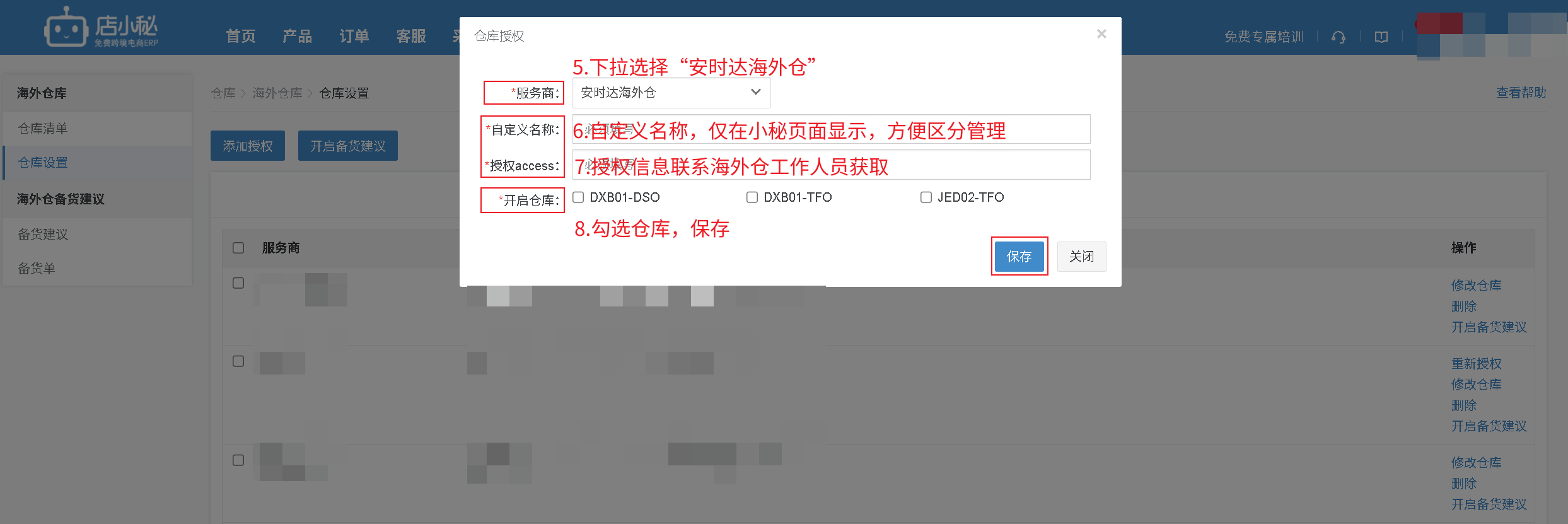 【仓库—海外仓库—仓库设置—添加授权—选择“安时达海外仓”—自定义名称、联系海外仓获取授权信息、勾选仓库—保存即可】
