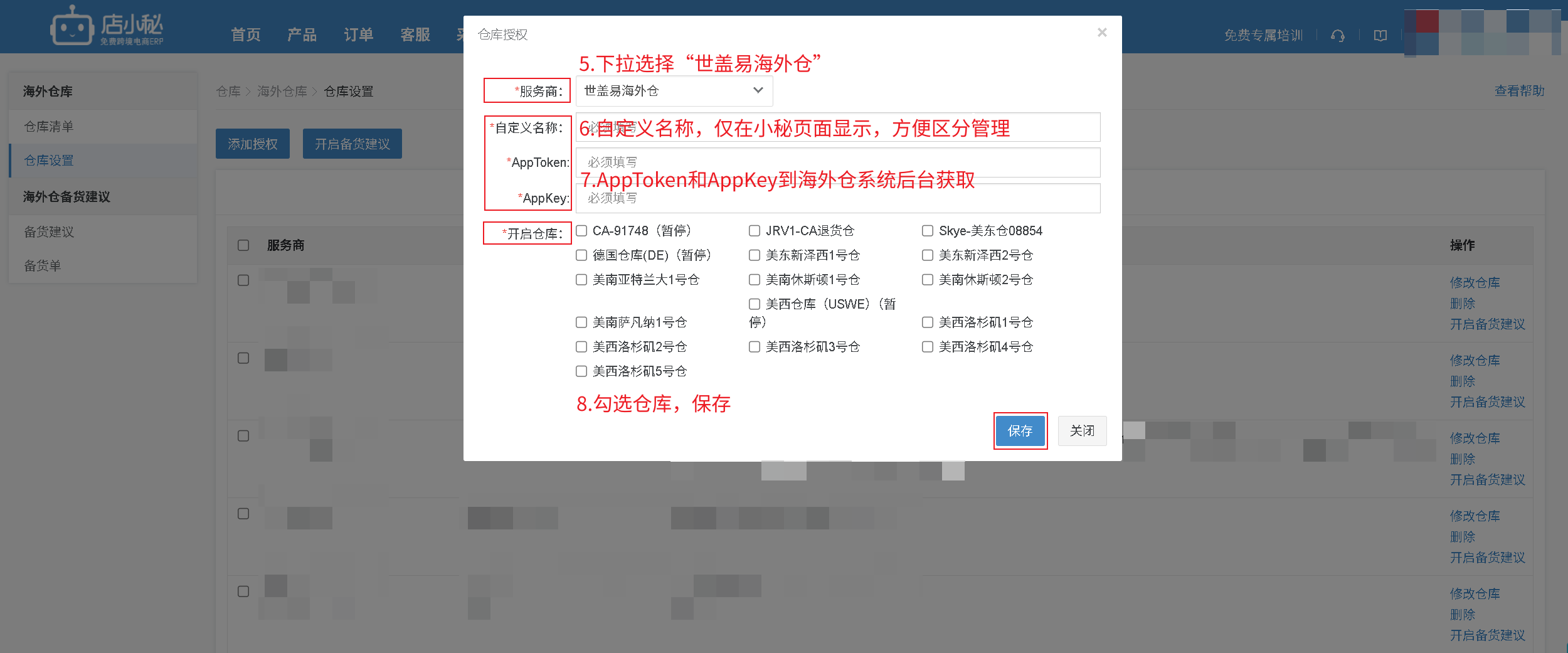【仓库—海外仓库—仓库设置—添加授权—选择“世盖易海外仓”—自定义名称、登录海外仓系统后台获取授权信息填写、勾选仓库—保存即可】