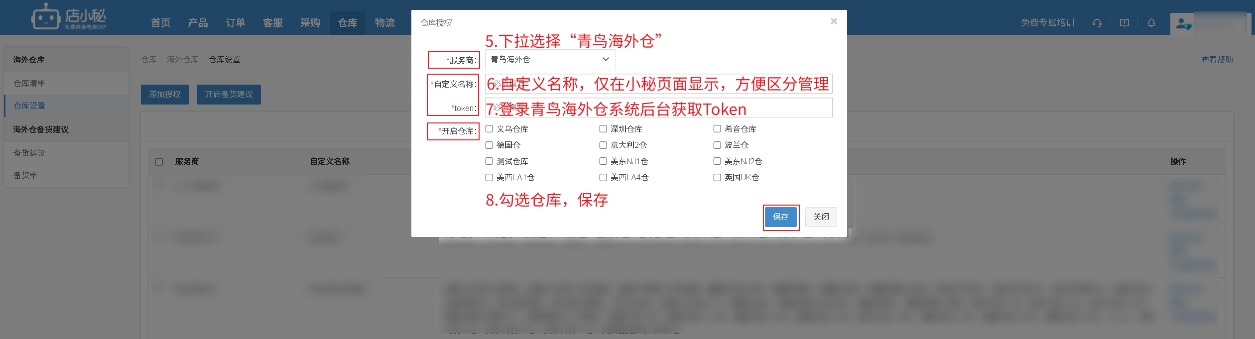 【仓库—海外仓库—仓库设置—添加授权—选择“青鸟海外仓”—自定义名称—登录海外仓系统后台获取Token填写—勾选仓库—保存即可】