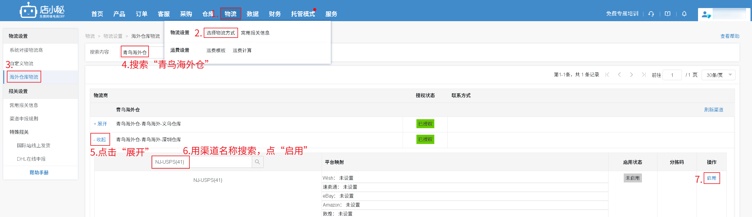 【物流—选择物流方式—海外仓仓库物流—找到对应启用的仓库—点击展开—启用—完善物流设置—保存】