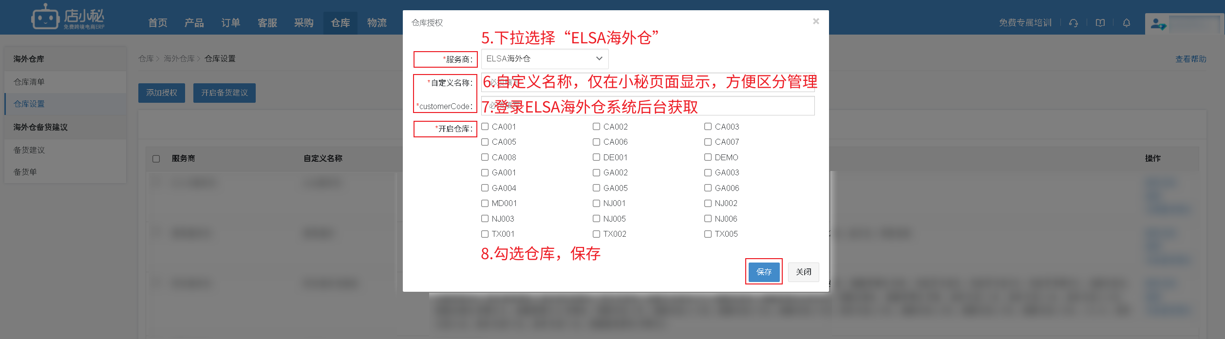 【仓库—海外仓库—仓库设置—添加授权—选择“ELSA海外仓”—自定义名称—登录海外仓系统后台获取—勾选仓库—保存即可】
