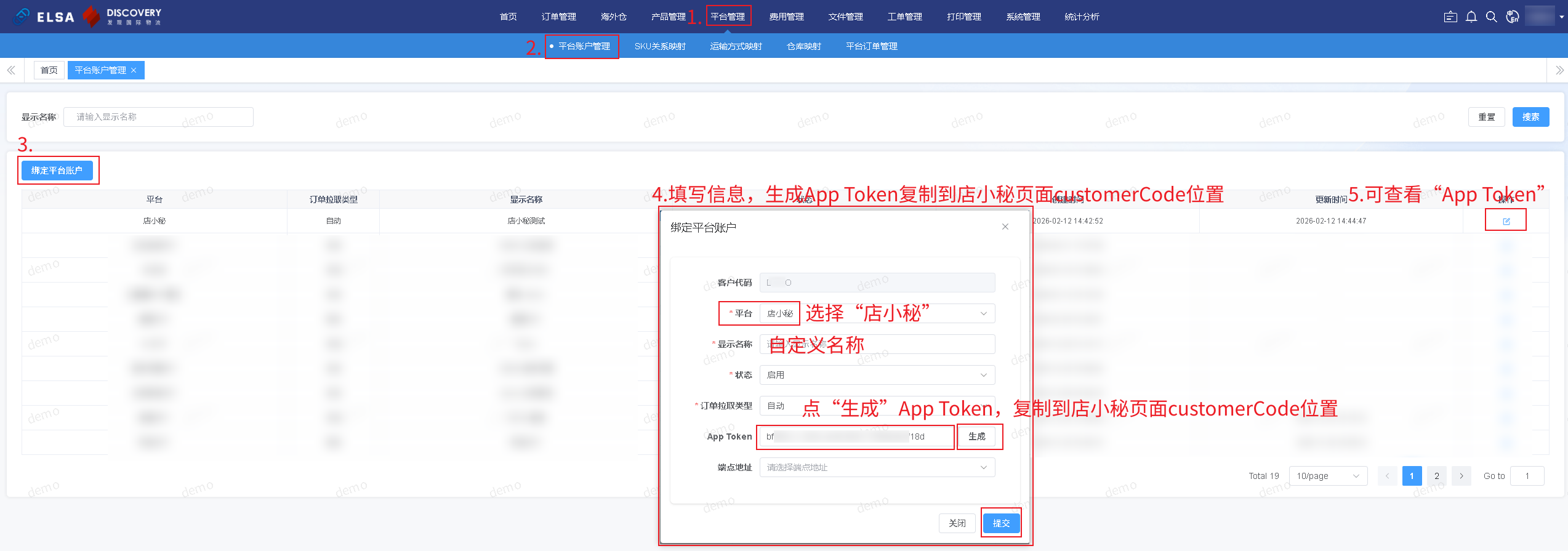 注意:登录ELSA海外仓系统后台平台管理-平台账号管理-绑定平台账号,生成App Token复制粘贴到店小秘海外仓授权页面customerCode填写