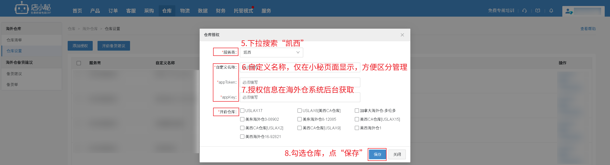 【仓库—海外仓库—仓库设置—添加授权—选择“凯西”—自定义名称—授权信息到海外仓系统后台获取—勾选仓库—保存即可】