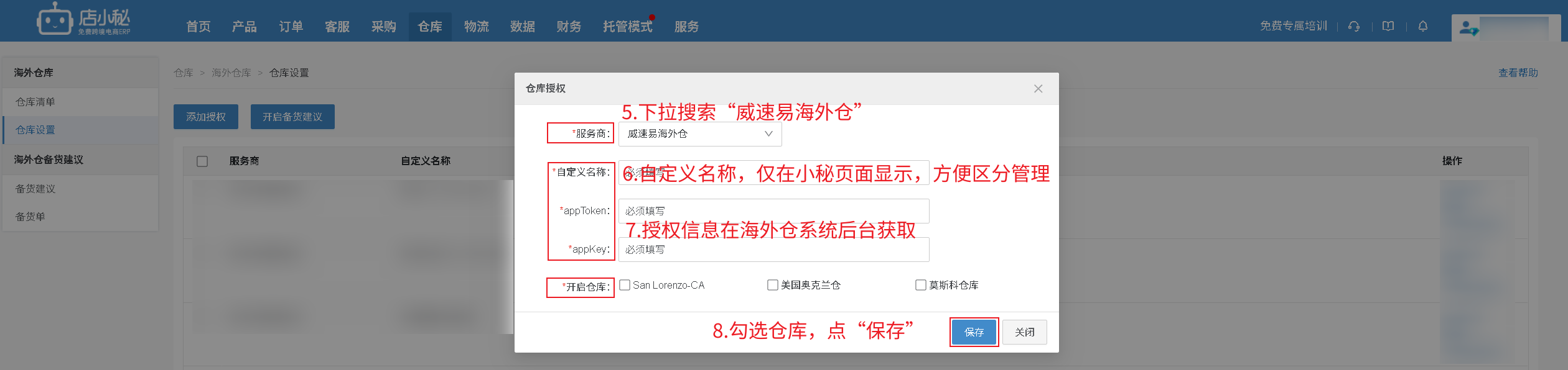 【仓库—海外仓库—仓库设置—添加授权—选择“威速易海外仓”—自定义名称—授权信息到海外仓系统后台获取—勾选