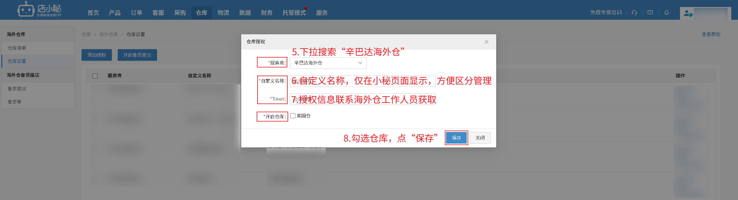 【仓库—海外仓库—仓库设置—添加授权—选择“辛巴达海外仓”—自定义名称—联系海外仓工作人员获取—勾选仓