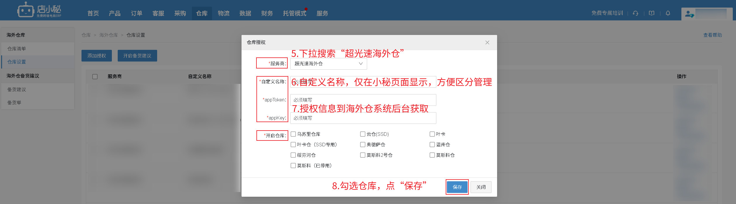 【仓库—海外仓库—仓库设置—添加授权—选择“超光速海外仓授权”—自定义名称—授权信息到海外仓系统后台获取—勾