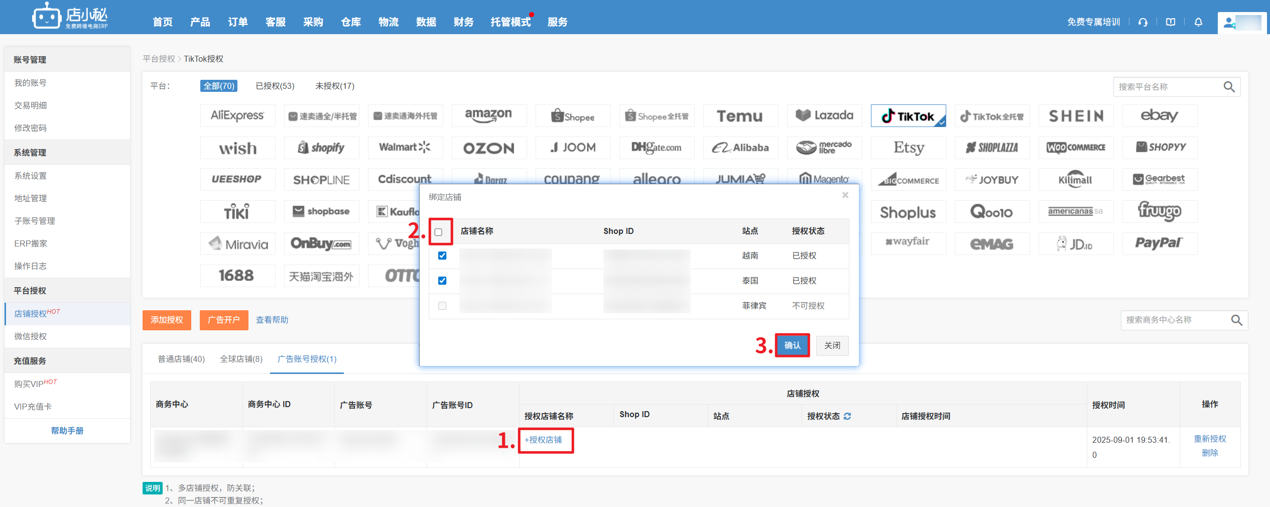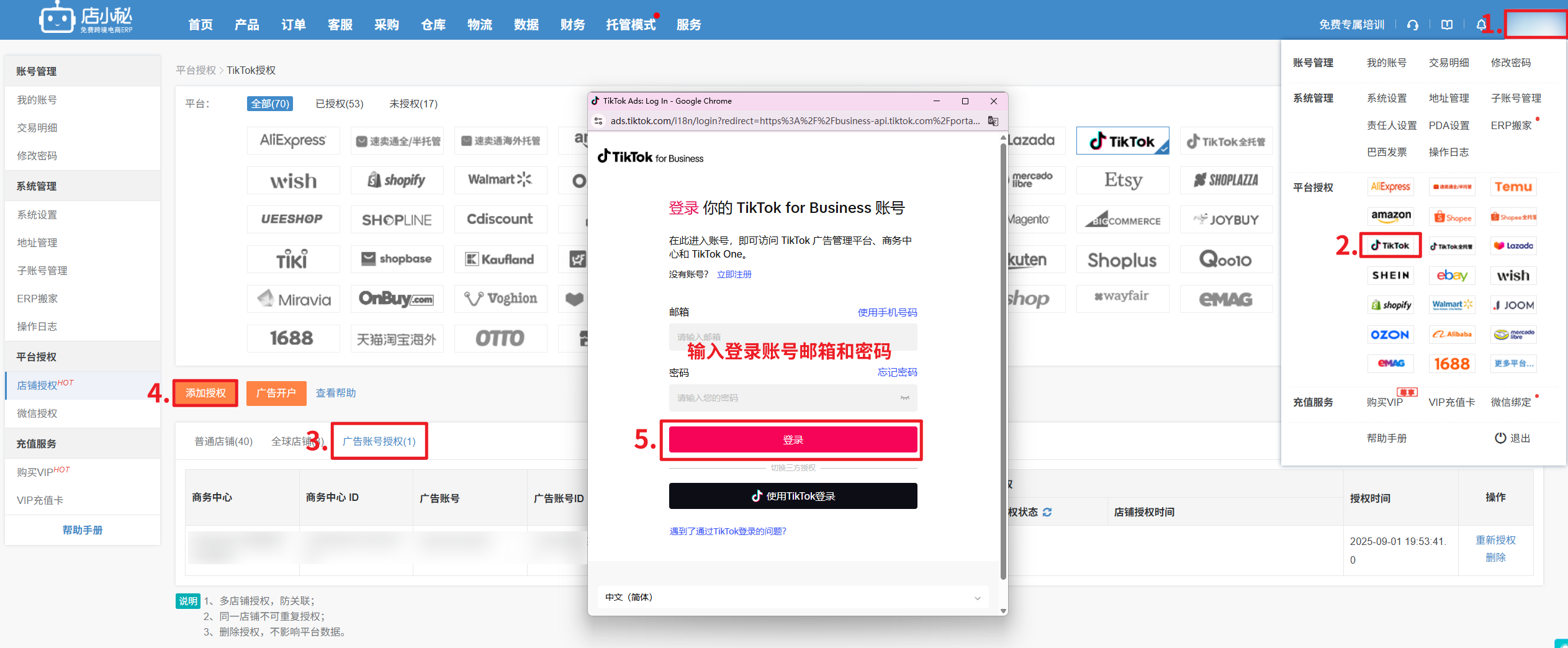 第一步:【店小秘主账号用户名—平台授权—TikTok—点击广告账号授权—添加授权
