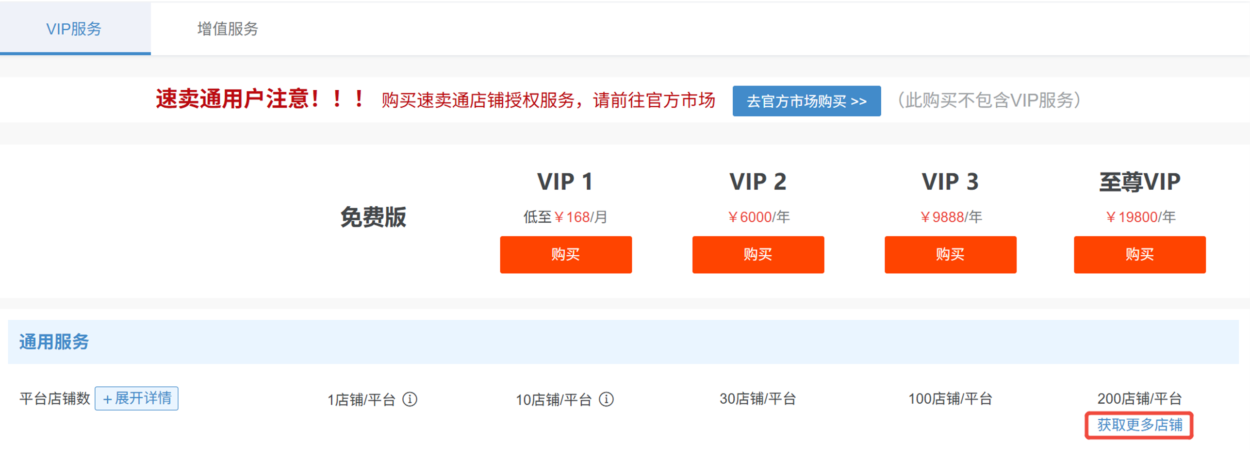 VIP1:10个、VIP2:30个、VIP3:100个、至尊VIP:200个;如需绑定更多,购买至尊VIP之后点获取更多店铺即可