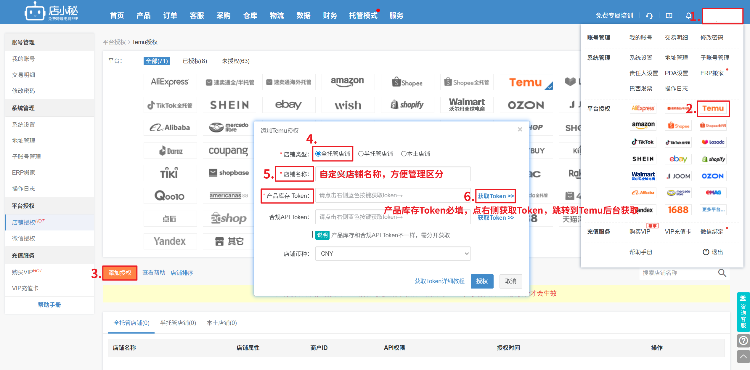 第一步:【登录小秘主账号—用户名—平台授权—点击Temu—添加授权—店铺类型选全托管店铺—自定义店铺名称