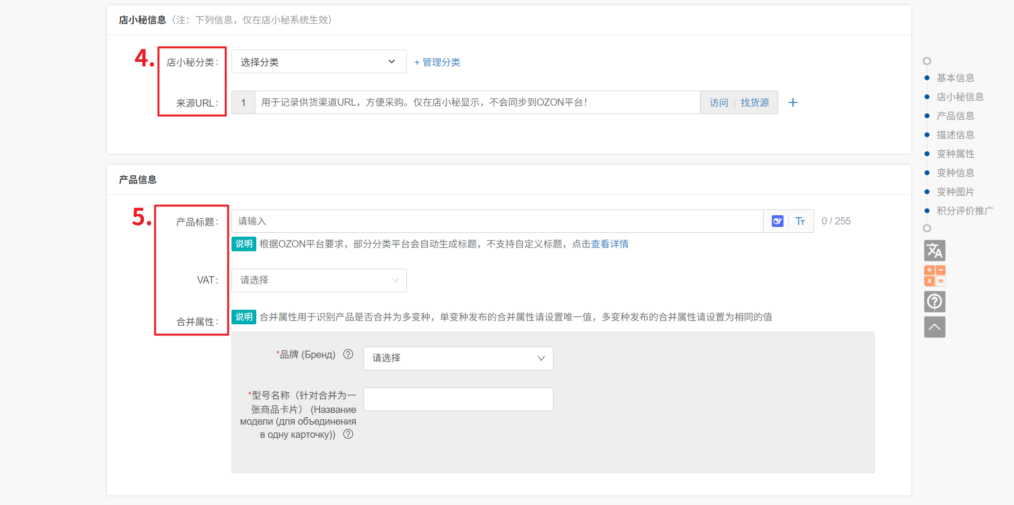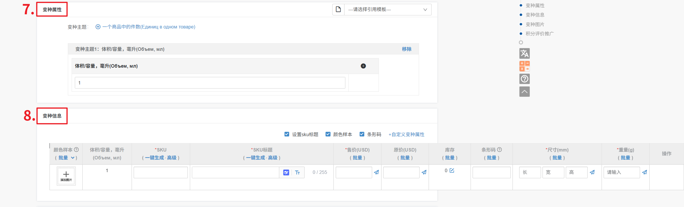 变种主题:不同产品分类,展示的变种信息不同,带*号必填,仅部分分类支持自定义属性值