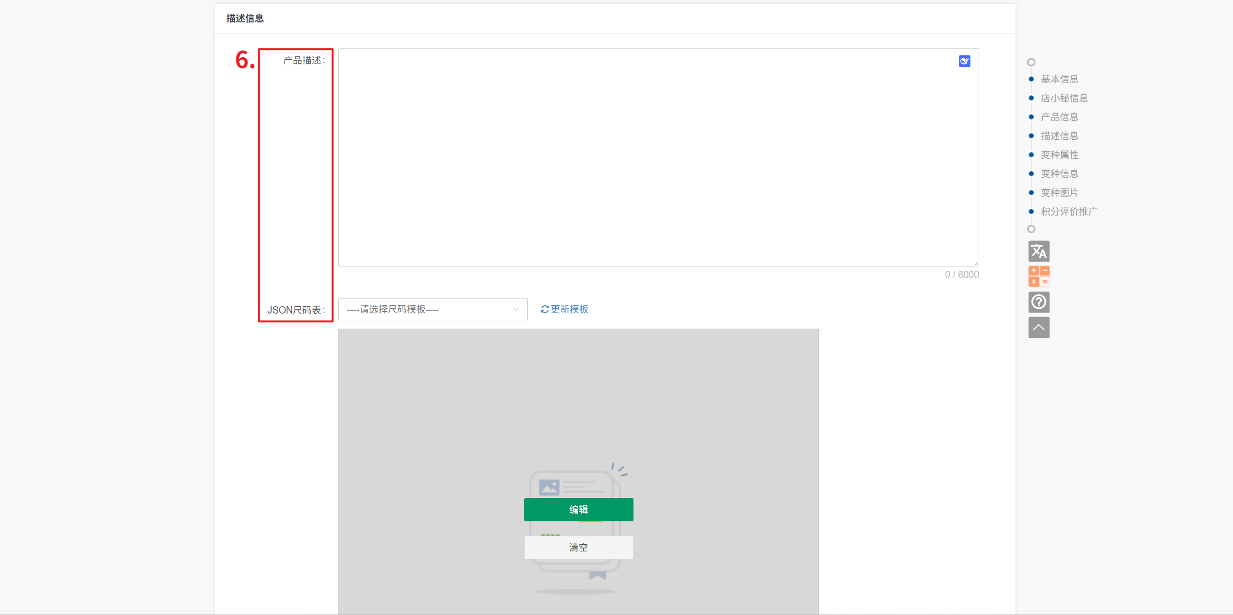 ① 产品描述:仅支持填写文字,需填写俄文,可输入中/英文 点击“一键翻译”,翻译为俄文,字符长度不能超过6000字符