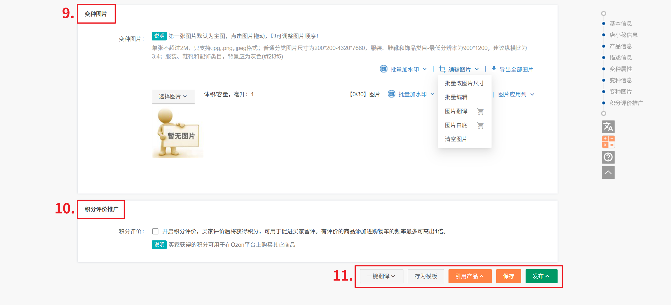 9、变种图片:1、每个变种可单独上传30张图片,第一张默认为变种主图,单张不超过2M,只支持jpg/png/jpeg格式