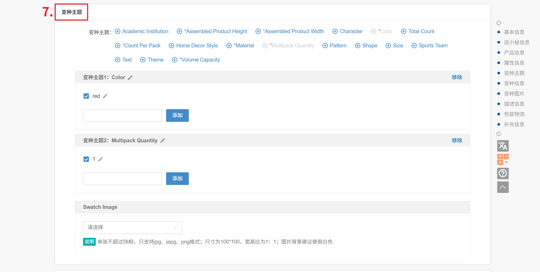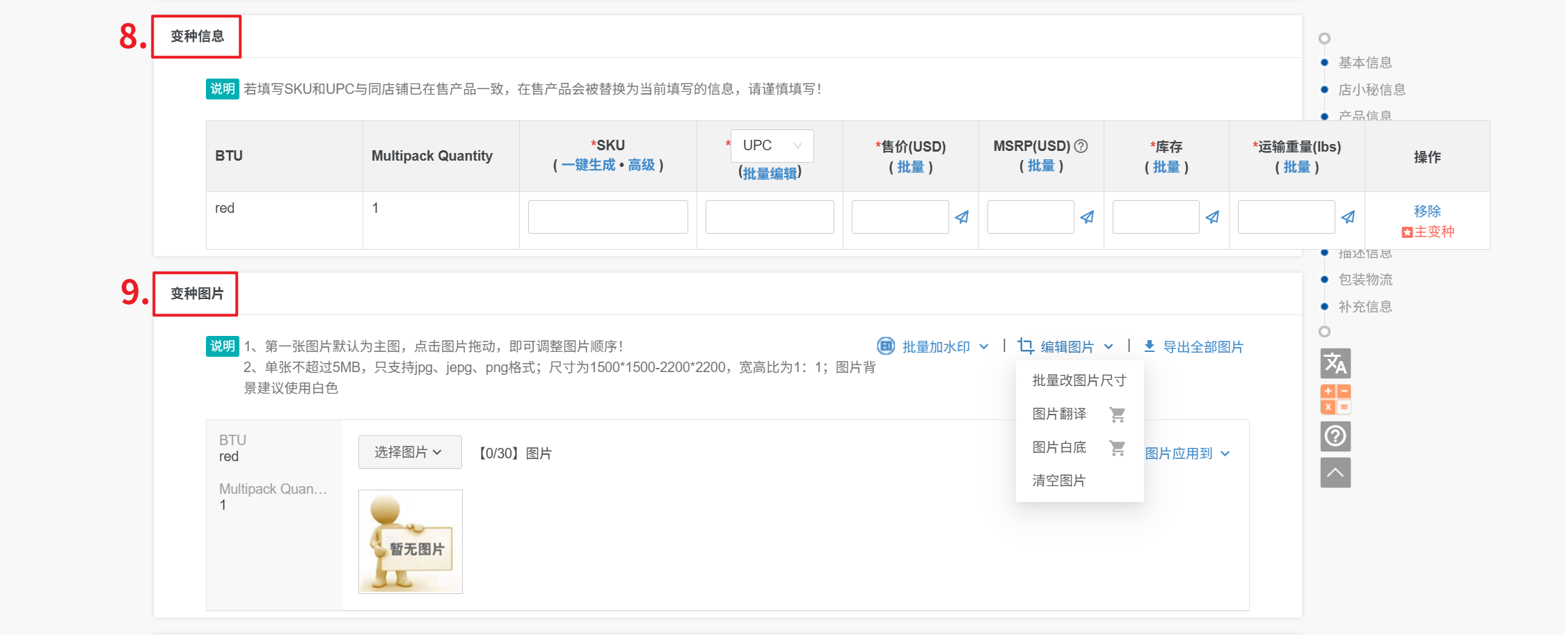 9、变种图片:1、每个变种可单独上传30张图片,第一张默认为变种主图,单张不超过5MB,只支持jpg、jepg、png格式
