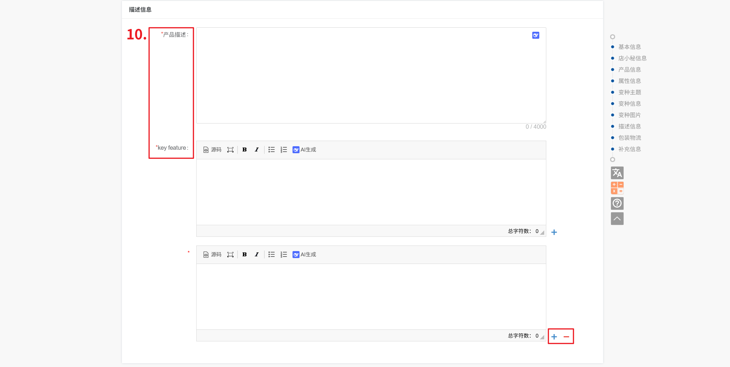 ① 产品描述:仅支持填写文字,需填写英文,可输入中文 点击“一键翻译”,翻译为英文