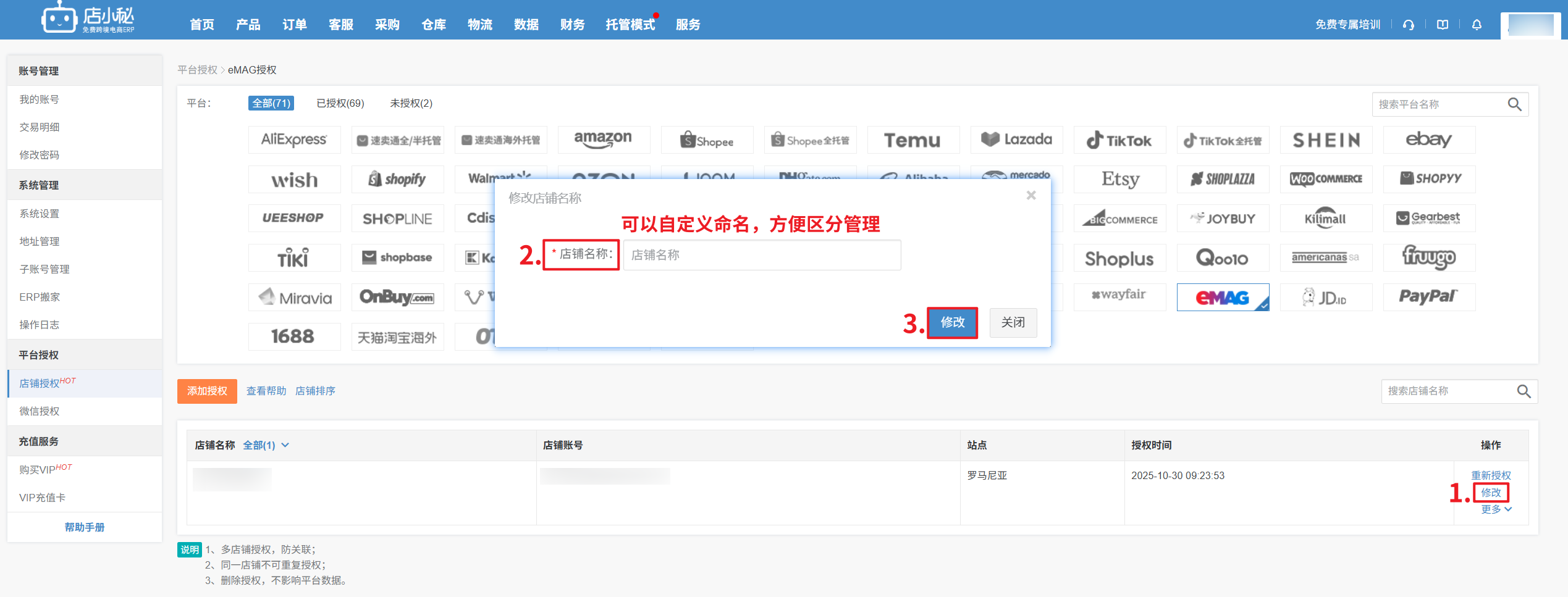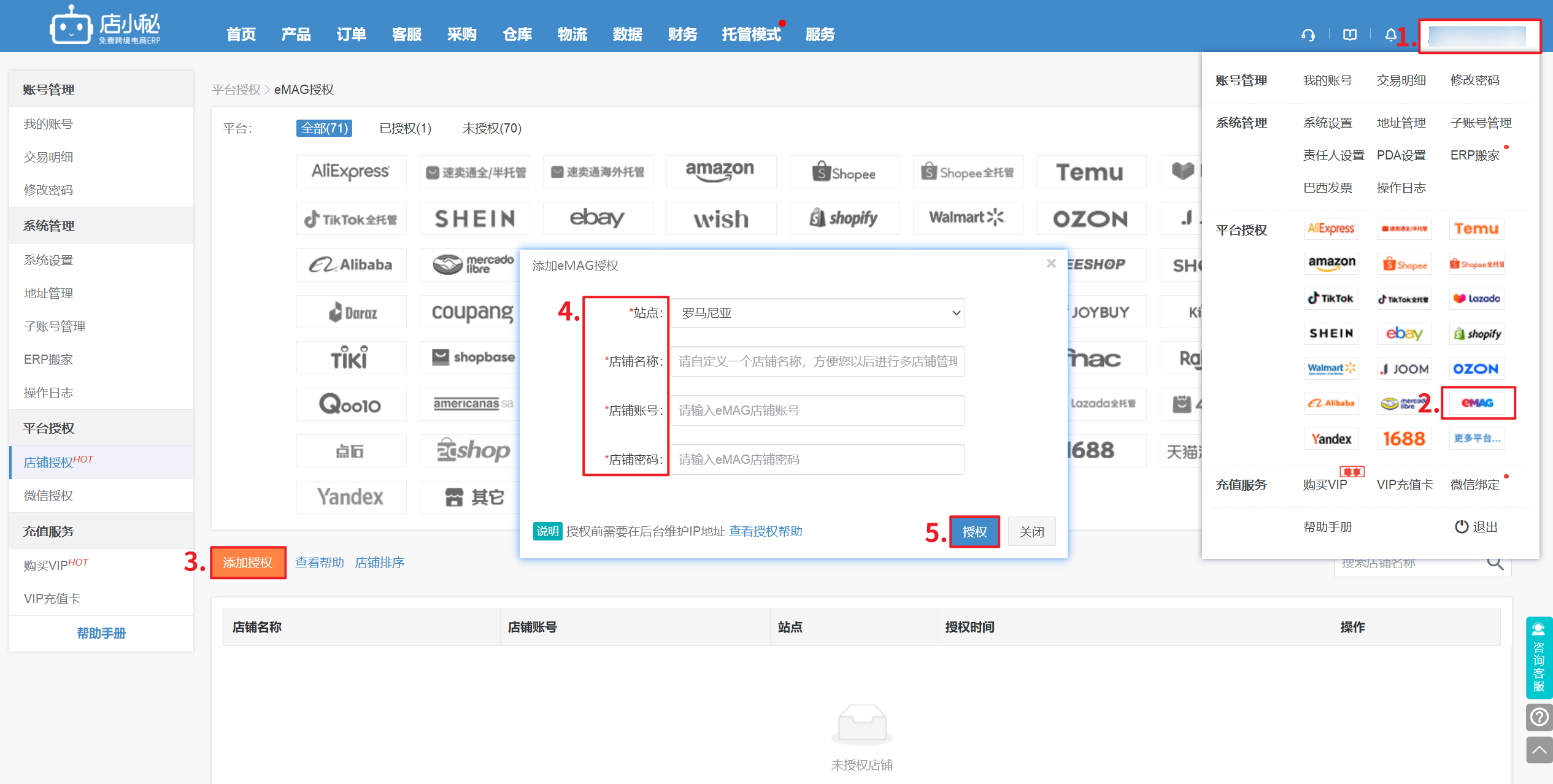 第二步:【登录店小秘主账号—用户名—平台授权—点击“eMAG”—添加授权—选择站点—自定义店铺名称—填写eMAG账号密码—授权】