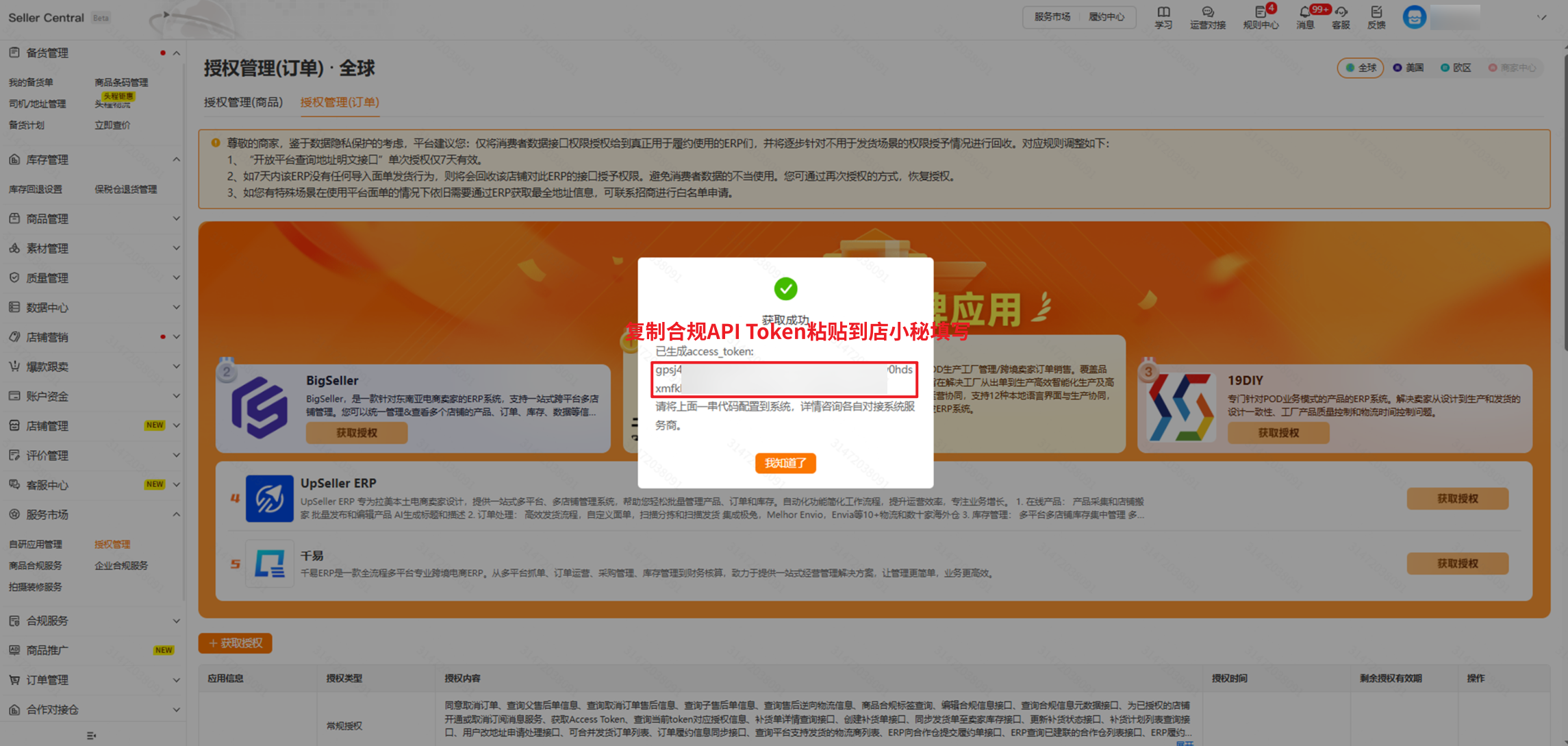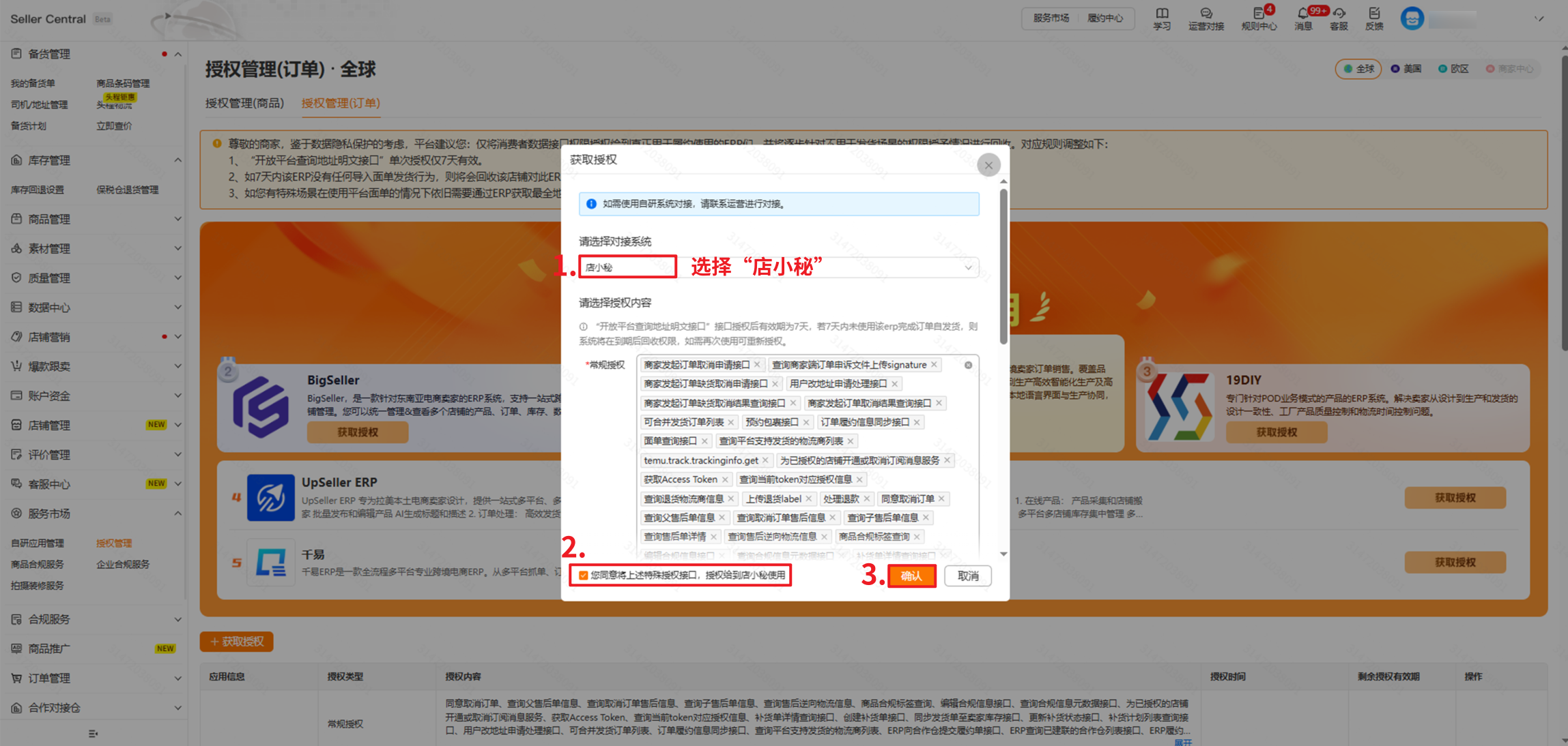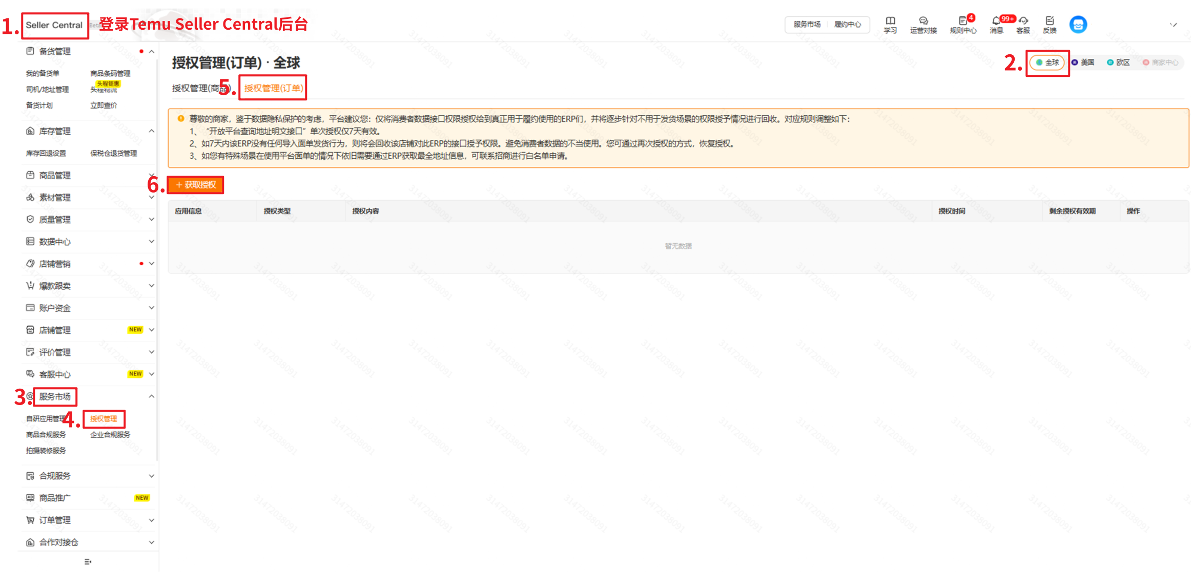 第二步:【Temu后台—Seller Central—右上角选择全球站点—服务市场—授权管理—授权管理(订单)