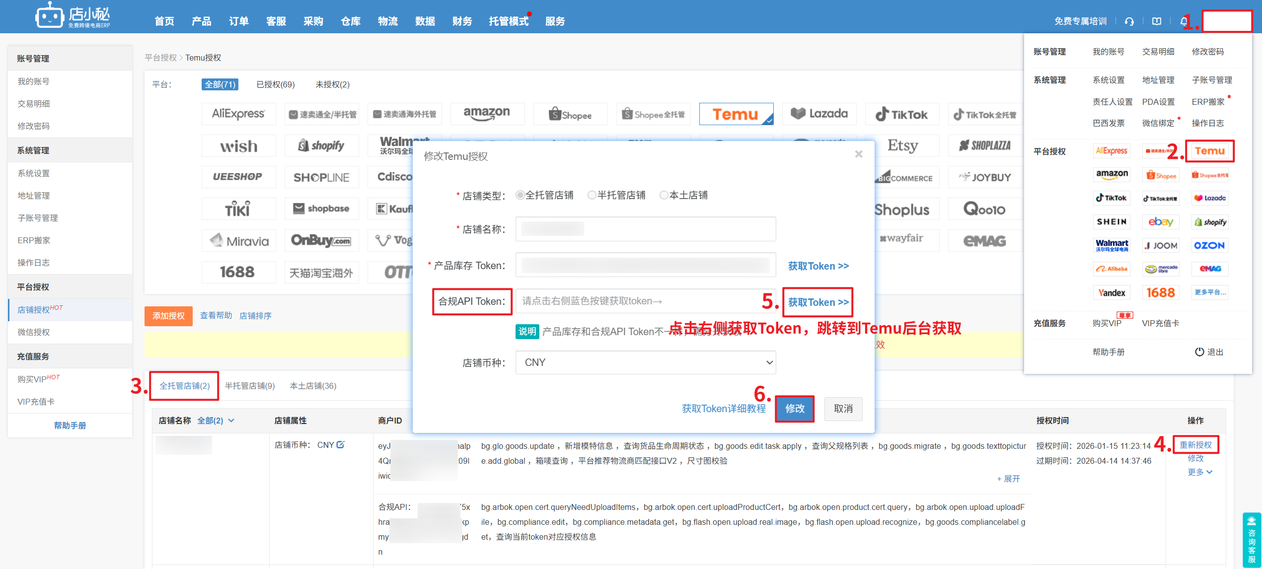 第一步:【登录小秘主账号—用户名—平台授权—点击Temu—重新授权—点击合规API Token后面的获取Token