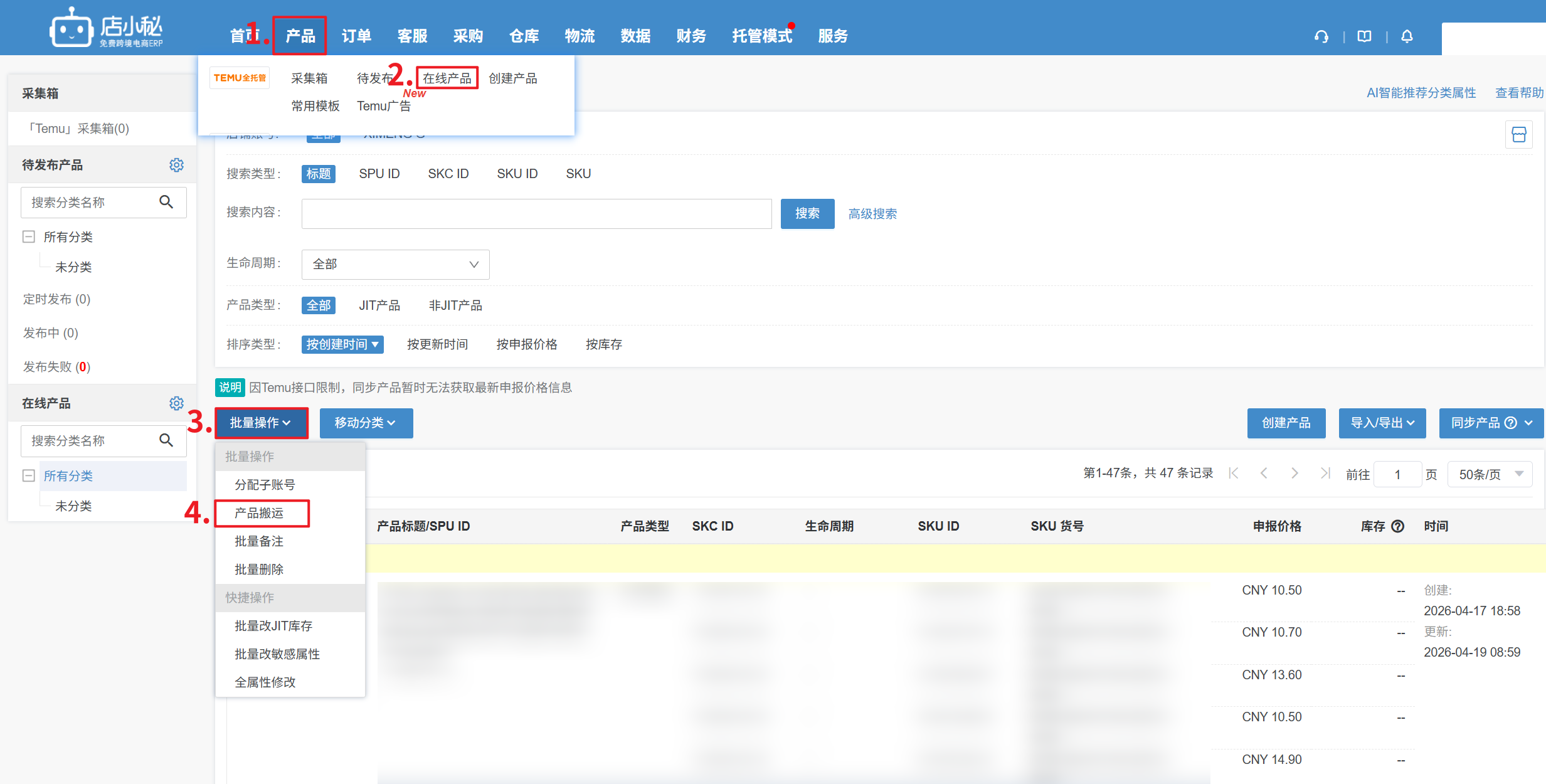 第一步:【产品—Temu全托管—在线产品—勾选产品—批量操作—产品搬运】