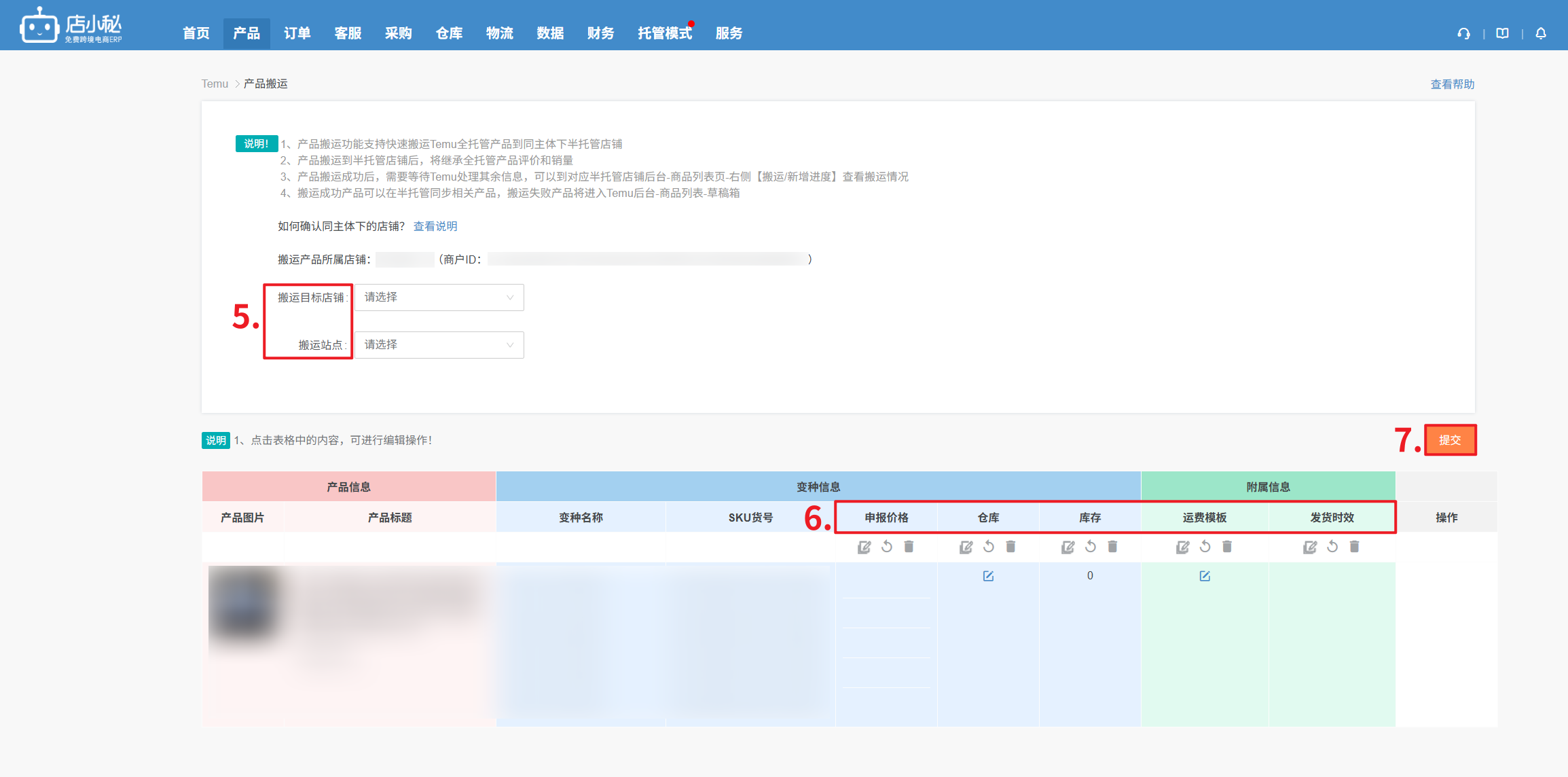 第二步:【选择搬运的目标店铺—选择搬运站点—设置站点价格、仓库、库存、运费模板、发货时效等信息—点击提交】