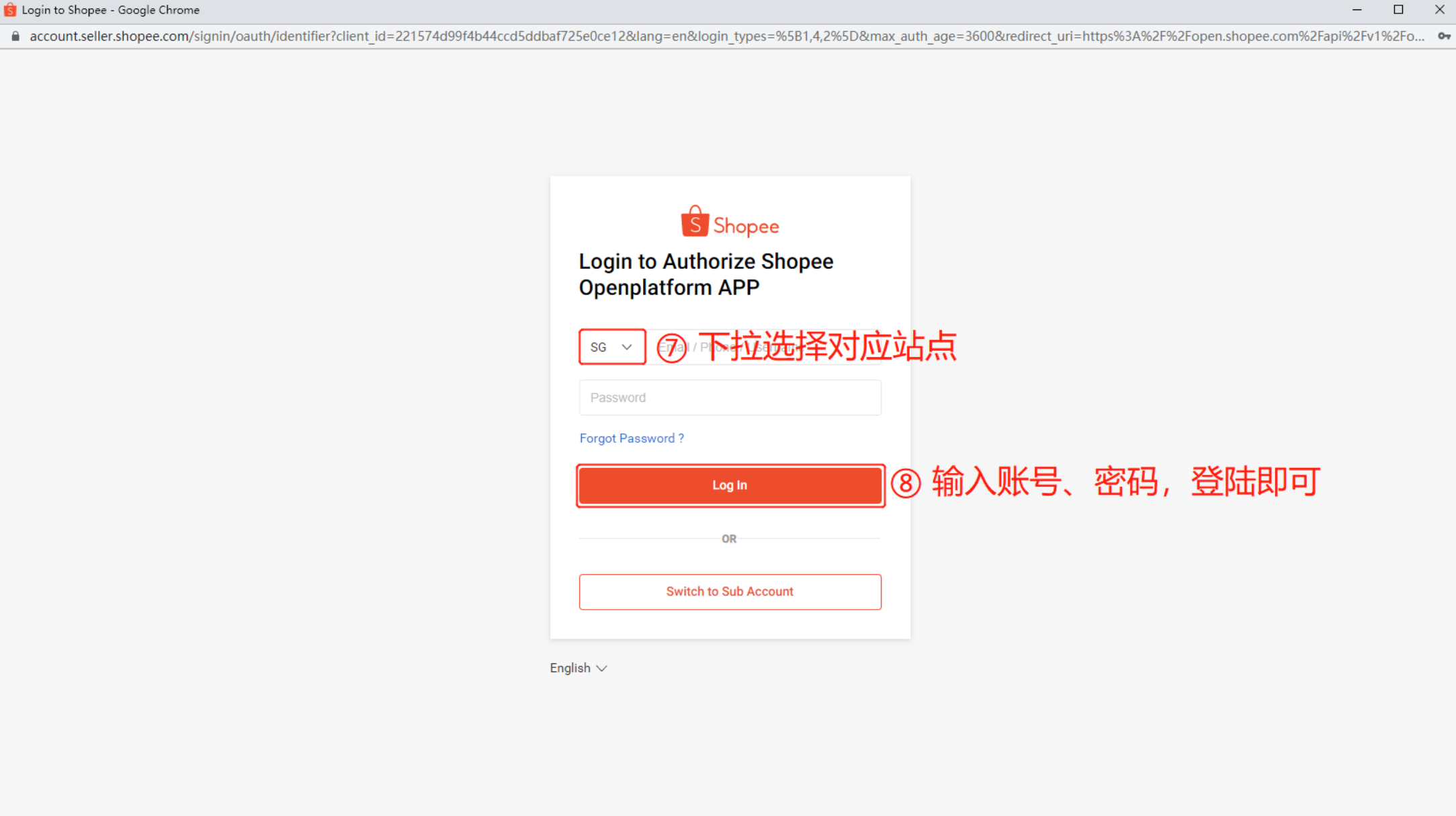 注意:如果您当前已经有登录Shopee后台,页面会直接显示您的Shopee账号,不要直接点击登录完成授权