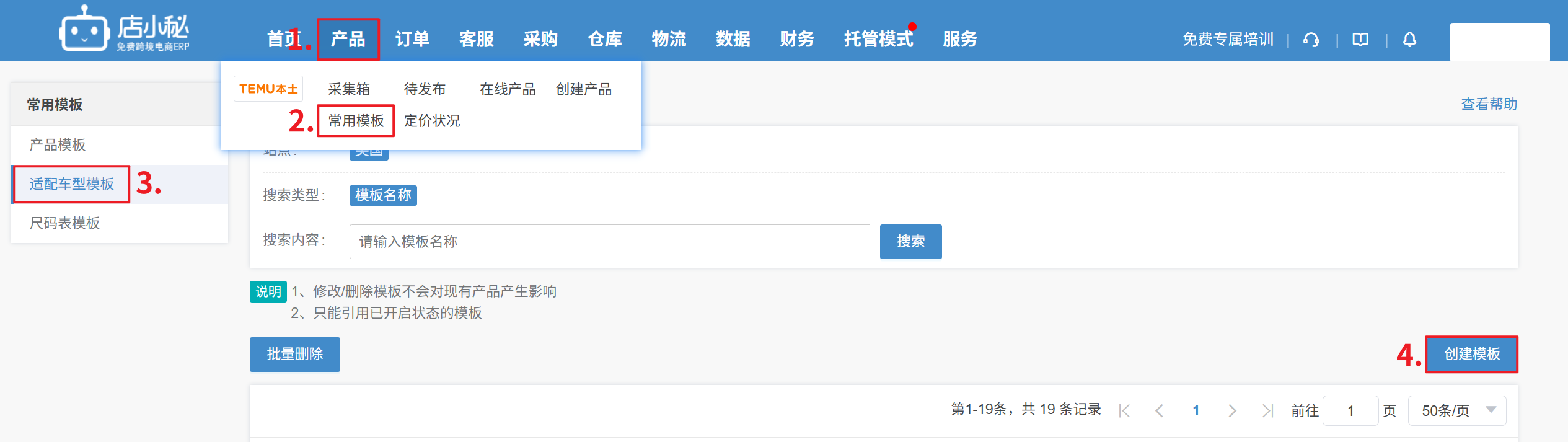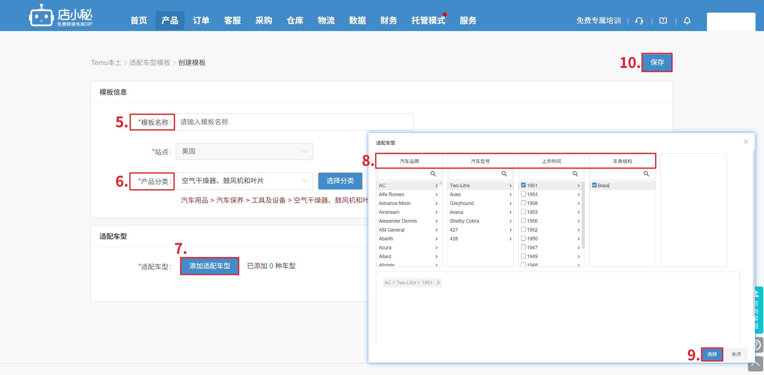 【产品—Temu本土—常用模板—创建模板—自定义模板名称—选择分类—添加适配车型—选择车型信息—保存】