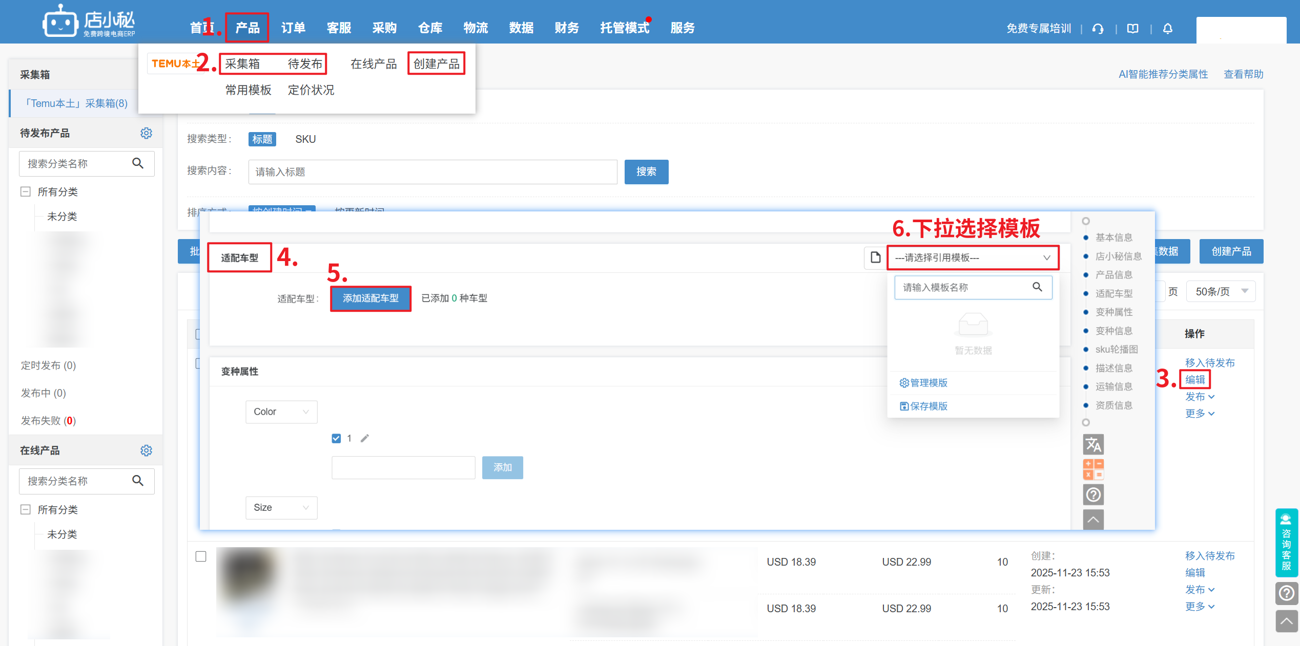 【产品—Temu本土—采集箱/待发布/创建产品—编辑—适配车型—添加适配车型—选择车型信息即可】
