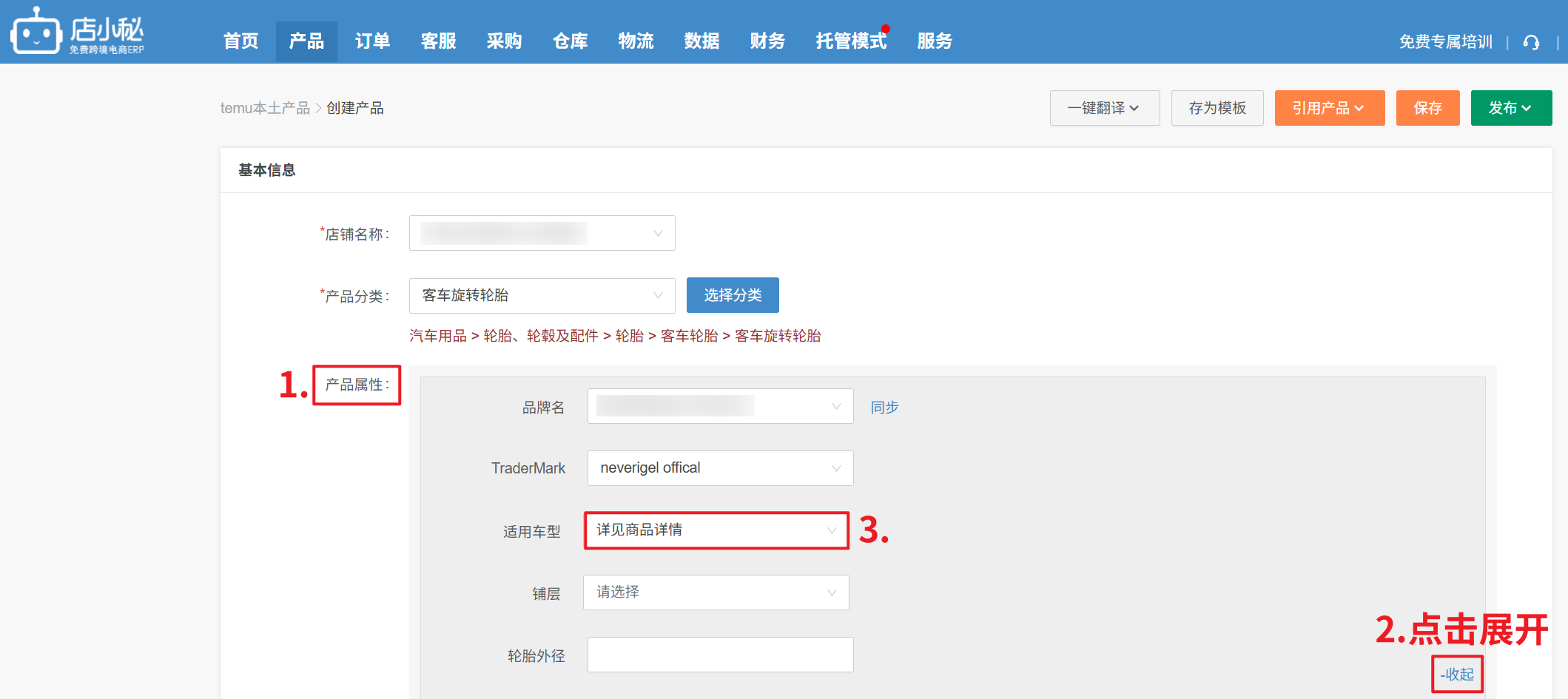 注意:1、车型库模板里选择的分类要跟当前发布的产品选择的分类一致,才可以选择对应的车型库模板