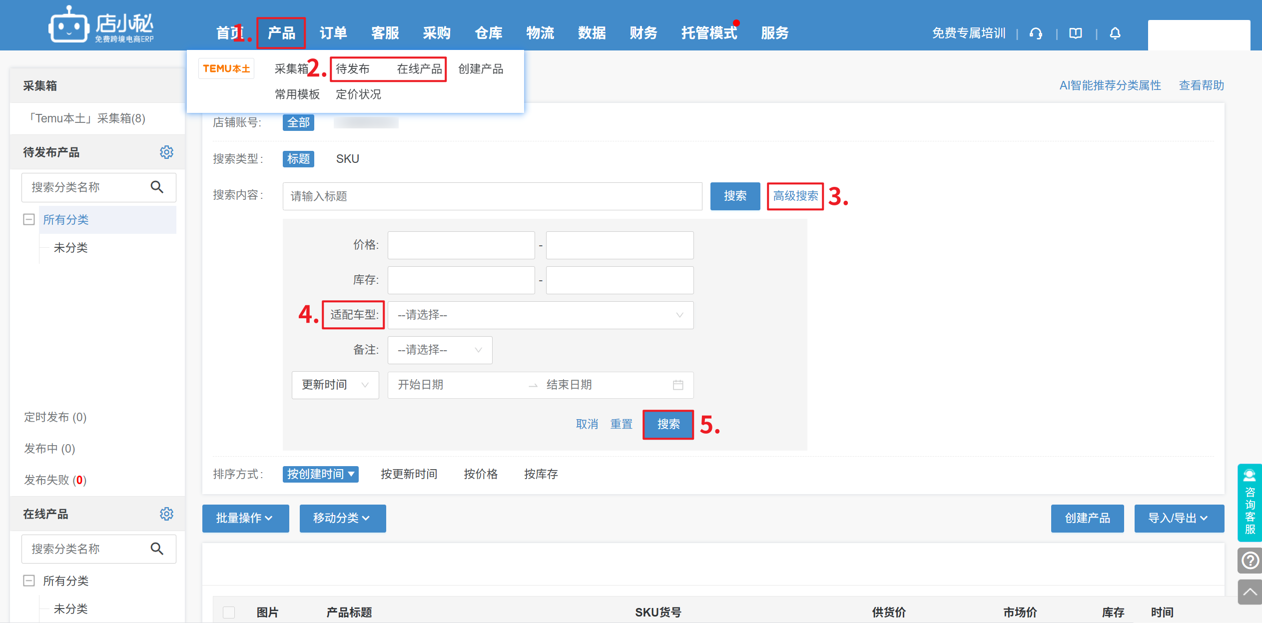 A1:【产品—Temu本土—待发布/在线产品—高级搜索—可筛选是否设置车型库的产品】