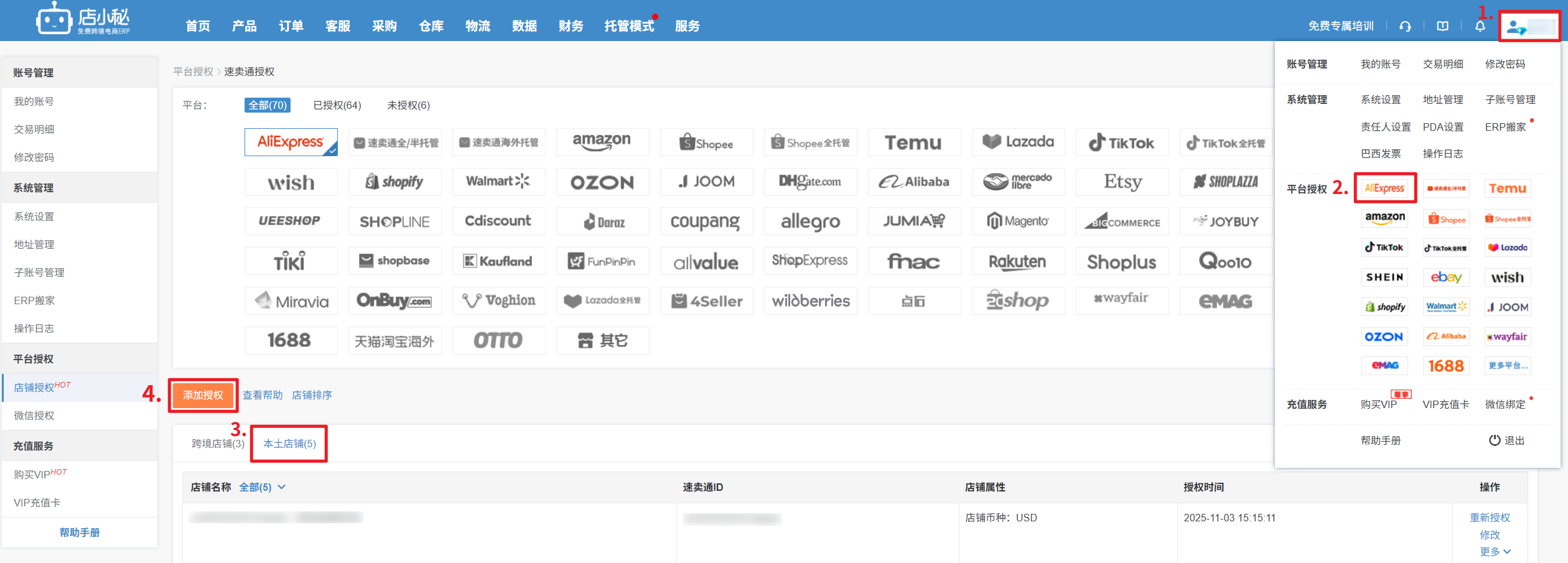 第一步:【登录店小秘主账号—用户名—平台授权—点击“AliExpress”—选择本土店铺—点击添加授权】