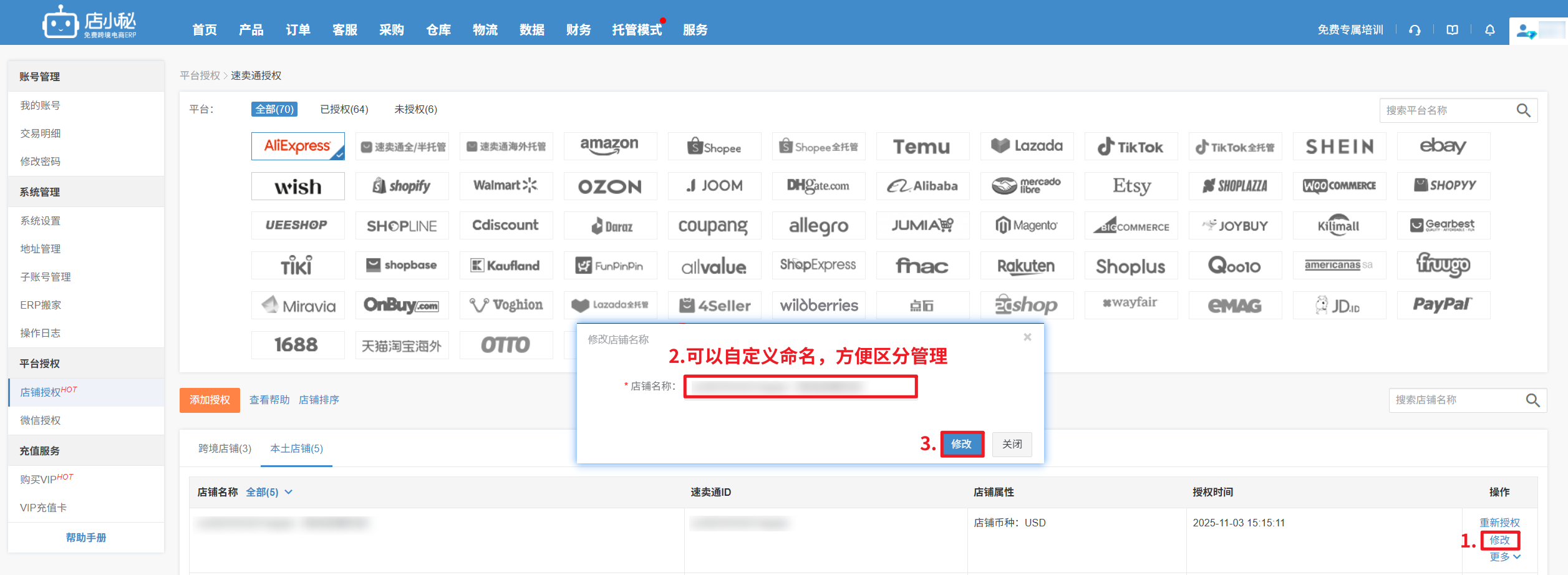授权成功后,可查看速卖通本土店铺ID、币种或自定义修改店铺名称,方便在小秘系统区分管理